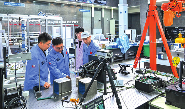 中國(guó)科學(xué)院空間光學(xué)系統(tǒng)在軌制造與集成重點(diǎn)實(shí)驗(yàn)室副主任徐振邦(左二)與同事在實(shí)驗(yàn)室內(nèi)討論科研工作(2023年5月25日攝) 許暢攝 / 本刊