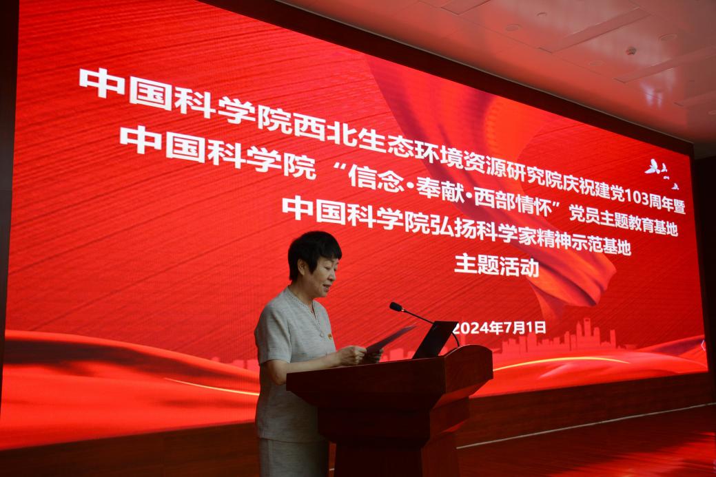 為慶祝中國(guó)共產(chǎn)黨成立103周年,7月1日,中國(guó)科學(xué)院西北生態(tài)環(huán)境資源研究院舉行中國(guó)科學(xué)院“信念·奉獻(xiàn)·西部情懷”黨員主題教育基地、中國(guó)科學(xué)院弘揚(yáng)科學(xué)家精神示范基地主題活動(dòng)。西北研究院黨委委員、領(lǐng)導(dǎo)班子成員、紀(jì)委委員、院務(wù)委員,黨支部書(shū)記、支部委員,研究室(中心)、實(shí)驗(yàn)室、野外臺(tái)站和管理部門(mén)黨員負(fù)責(zé)人,黨員代表等參加活動(dòng)。黨委副書(shū)記、紀(jì)委書(shū)記王萍主持活動(dòng)。