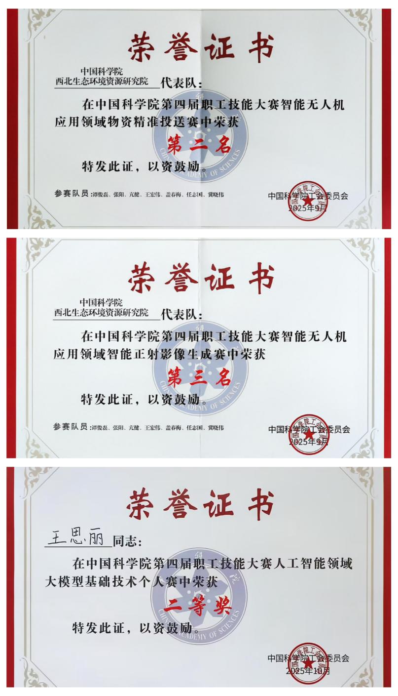 在西北研究院黨委的高度重視與工會(huì)的精心組織下,科研團(tuán)隊(duì)積極響應(yīng)、踴躍參賽。智能無(wú)人機(jī)應(yīng)用領(lǐng)域,由黑河遙感試驗(yàn)研究站譚俊磊、亢健、張陽(yáng)等6名選手組成的團(tuán)隊(duì)通過(guò)精準(zhǔn)路徑規(guī)劃與動(dòng)態(tài)負(fù)載調(diào)控,實(shí)現(xiàn)復(fù)雜環(huán)境下物資的穩(wěn)定投送,依托自研靶標(biāo)識(shí)別程序,顯著提升正射影像數(shù)據(jù)處理效率,榮獲了“物資精準(zhǔn)投送”賽道全院第二名,“智能正射影像生成”賽道全院第三名和團(tuán)隊(duì)三等獎(jiǎng)。在網(wǎng)信智能應(yīng)用服務(wù)領(lǐng)域,國(guó)家冰川凍土沙漠科學(xué)數(shù)據(jù)中心團(tuán)隊(duì)將專(zhuān)業(yè)領(lǐng)域數(shù)據(jù)和服務(wù)能力與AI的強(qiáng)大分析推理能力結(jié)合,實(shí)現(xiàn)自然語(yǔ)言交互、數(shù)據(jù)智能分析和可視化展示,提升了數(shù)據(jù)中心的智能化服務(wù)水平,榮獲了“MCP云服務(wù)”賽道三等獎(jiǎng)。在人工智能領(lǐng)域,文獻(xiàn)情報(bào)中心王思麗基于中國(guó)科學(xué)院 “磐石?科學(xué)基礎(chǔ)大模型”,圍繞人工智能基礎(chǔ)理論、實(shí)操能力與知識(shí)融合推理能力展開(kāi)角逐,榮獲“大模型基礎(chǔ)技術(shù)個(gè)人賽”二等獎(jiǎng)。