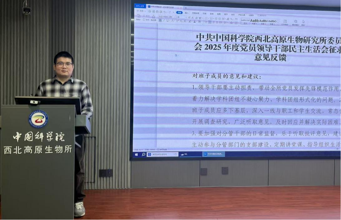 組織委員劉博向全體參會人員通報《中共中國科學(xué)院西北高原生物研究所委員會2025年度黨員領(lǐng)導(dǎo)干部民主生活會征求意見反饋》的情況。預(yù)備黨員唐有林,發(fā)展對象盧露、孟頤新、李霞、李子雁,入黨積極分子吳玥、宋枚汐依次匯報了本季度思想動態(tài)、學(xué)習(xí)進(jìn)展及工作成效。