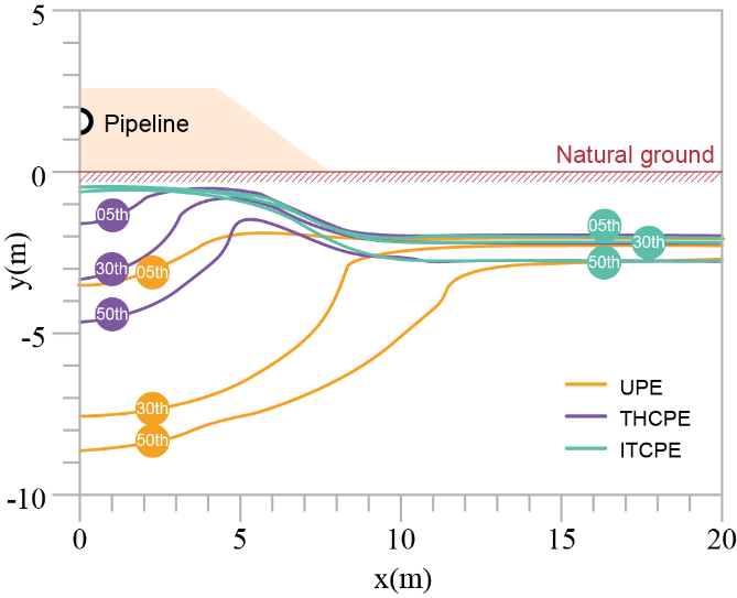 基于上述科學(xué)問題,中國科學(xué)院西北生態(tài)環(huán)境資源研究院科研團(tuán)隊(duì)研究提出一種新型倒T型碎石管道路堤(ITCPE)結(jié)構(gòu),該結(jié)構(gòu)基于“煙囪效應(yīng)”原理,利用管道自身熱量強(qiáng)化對(duì)流,可更有效地帶走管道熱量,冷卻凍土。此外,基于現(xiàn)場(chǎng)監(jiān)測(cè)系統(tǒng)的實(shí)測(cè)邊界,結(jié)合多孔介質(zhì)及相變理論,對(duì)ITCPE、無保護(hù)管道路堤(UPE)和傳統(tǒng)水平碎石管道路堤(THCPE)結(jié)構(gòu)在長期運(yùn)行過程中的熱效應(yīng)進(jìn)行了長期數(shù)值預(yù)測(cè)。研究結(jié)果表明,無論是有保溫層的埋地管道結(jié)構(gòu)、無防護(hù)的管堤結(jié)構(gòu),還是傳統(tǒng)的水平碎石管堤結(jié)構(gòu),都無法很好地解決中俄原油管線融沉問題。但新型ITCPE結(jié)構(gòu)可以有效減緩管道融沉問題,而且在管道運(yùn)營50年內(nèi)可顯著維持管堤下伏凍土的人為凍土上限高度。相關(guān)研究結(jié)果為中俄原油管線提供了技術(shù)支持,同時(shí)也為全球多年凍土區(qū)其他管道工程的設(shè)計(jì)和維護(hù)提供科學(xué)參考。