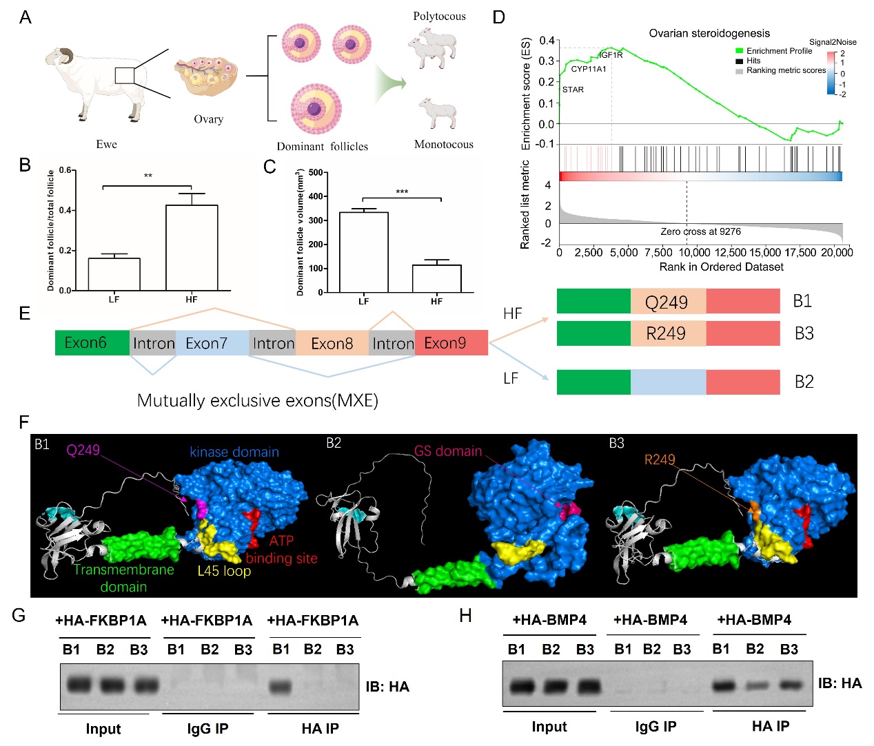 中國科學院西北高原生物研究所動物生態(tài)與資源保護研究團隊針對綿羊重要繁殖性狀(產(chǎn)羔數(shù)和產(chǎn)羔間隔),以連續(xù)三個產(chǎn)羔季節(jié)產(chǎn)多胎(每胎產(chǎn)兩羔或三羔,HF)和產(chǎn)單胎(每胎產(chǎn)一羔,LF)的藏羊為研究對象,整合全基因組關(guān)聯(lián)分析、普通轉(zhuǎn)錄組學、單細胞轉(zhuǎn)錄組學、蛋白質(zhì)組學和代謝組學等多組學研究方法,結(jié)合KASP基因分型、實時熒光定量PCR、酶聯(lián)免疫吸附實驗、免疫共沉淀和蛋白質(zhì)免疫印跡等分子功能驗證實驗,挖掘藏羊產(chǎn)羔數(shù)和產(chǎn)羔間隔關(guān)鍵調(diào)控元件并揭示其高繁殖力的遺傳調(diào)控機制。全基因組關(guān)聯(lián)研究表明,BMPR1B基因與產(chǎn)羔數(shù)性狀相關(guān),PAPPA基因與產(chǎn)羔間隔性狀相關(guān)。首次構(gòu)建了藏羊卵巢單細胞圖譜,發(fā)現(xiàn)關(guān)鍵基因PAPPA特異性表達在壁層顆粒細胞亞群,且BMPR1B基因在壁層顆粒細胞和固醇生成顆粒亞群高表達?;趩渭毎D(zhuǎn)錄組學、蛋白質(zhì)組學和代謝組學整合分析,發(fā)現(xiàn)PAPPA是刺激卵巢優(yōu)勢卵泡生長發(fā)育和類固醇生成的關(guān)鍵候選基因。繁殖主效基因BMPR1B除了非同義突變,首次在藏羊中發(fā)現(xiàn)BMPR1B還存在可變剪接事件調(diào)控多胎性狀。該研究結(jié)果對分子精準選育提升藏羊繁殖力和實現(xiàn)藏羊產(chǎn)業(yè)提質(zhì)增效具有重要意義。