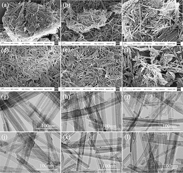 圖1. 凹凸棒石原礦(a,g)及其不同工藝條件下超聲輔助解離后(b-f,h-l)的SEM和TEM 圖