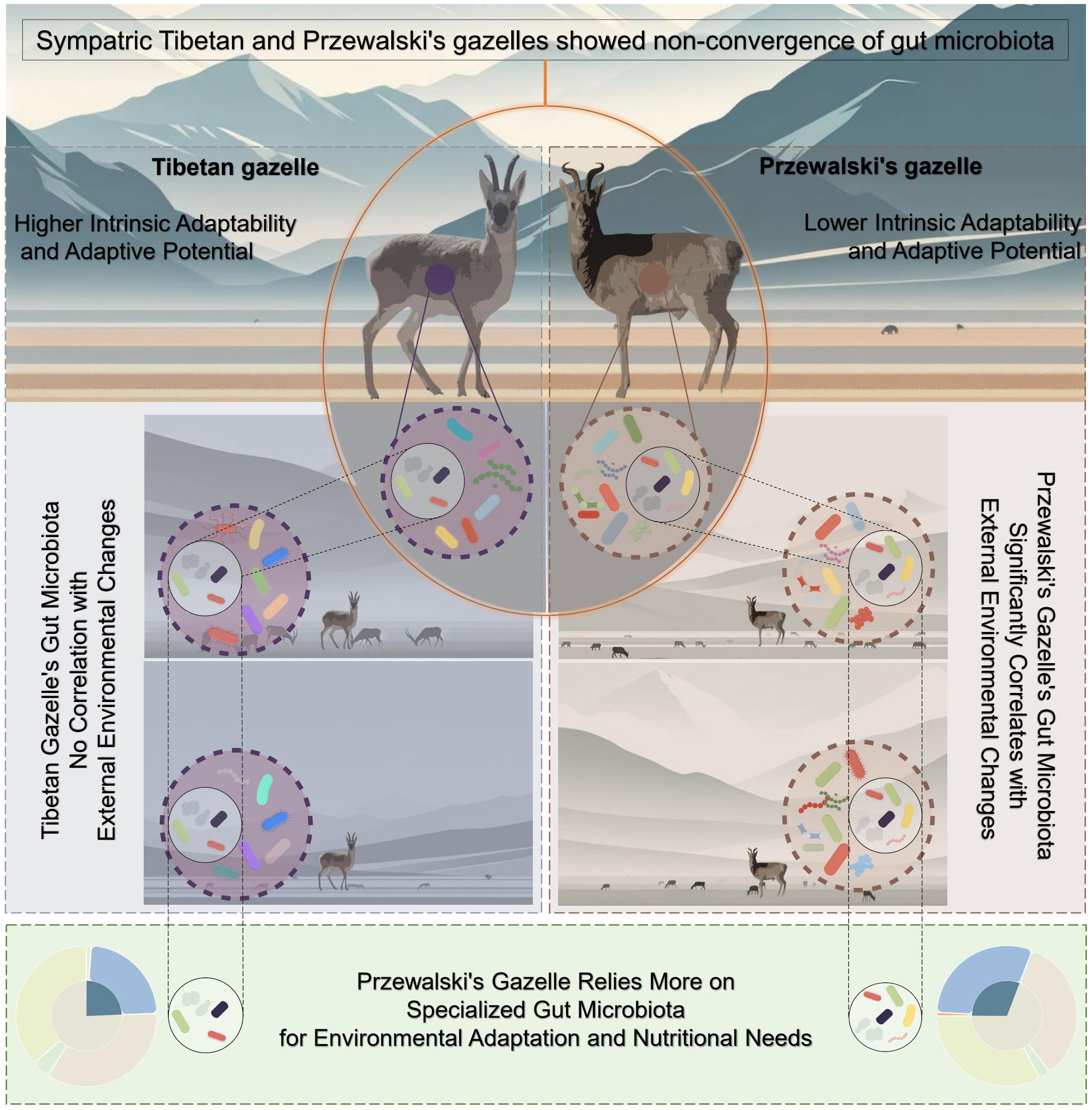 研究論文?Gut microbiota non-convergence and adaptations in sympatric Tibetan and Przewalski’s gazelles?發(fā)表在?Cell Press?旗下交叉學科期刊?iScience(中國科學院二區(qū))。西北高原所博士研究生宋鵬飛為第一作者,張同作研究員為通訊作者。該研究得到了國家自然科學基金區(qū)域創(chuàng)新發(fā)展聯(lián)合基金(U20A2012)等項目的支持。學科組依托中國科學院高原生物適應與進化重點實驗室和青海省動物生態(tài)基因組學重點實驗室。