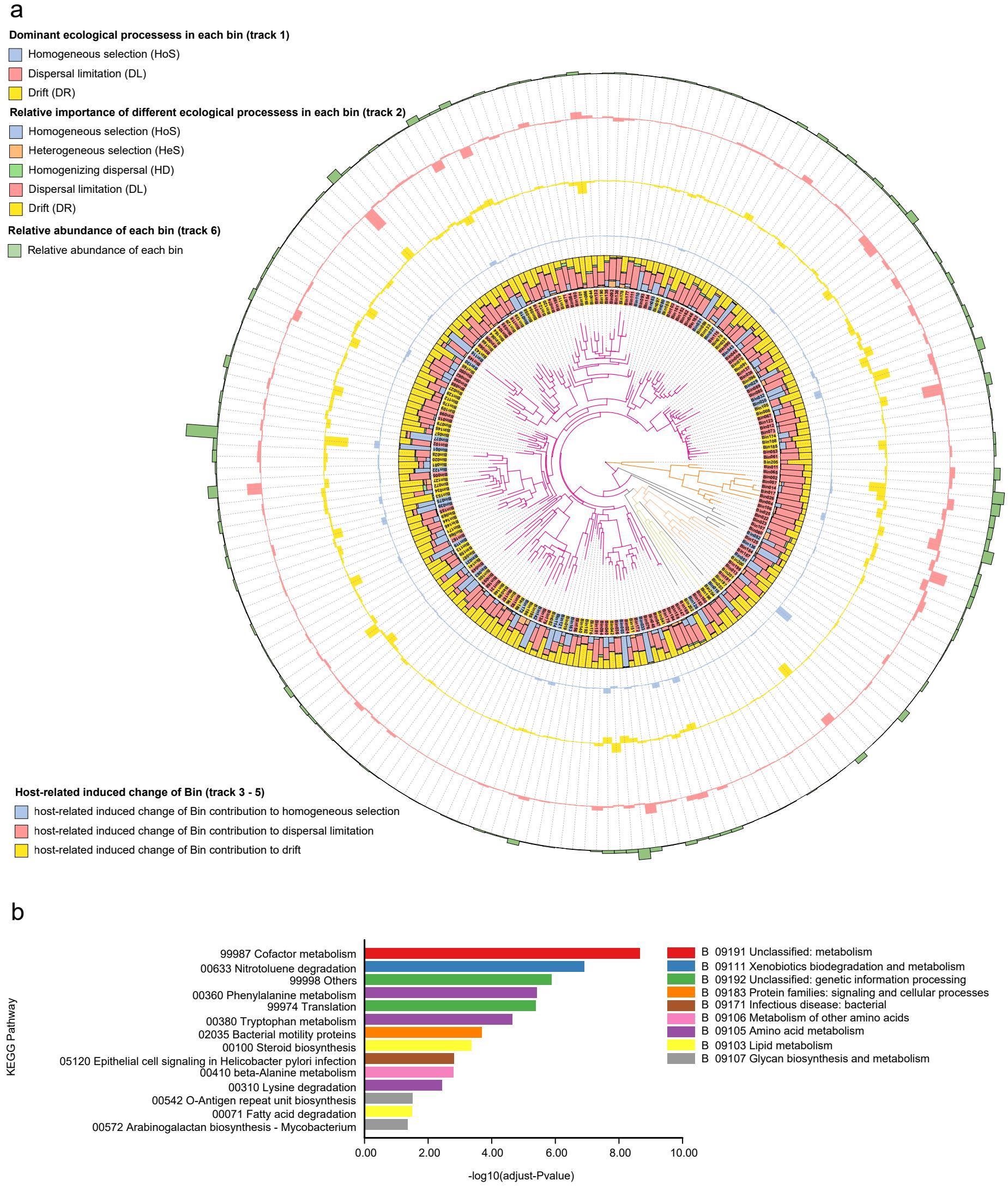 藏原羚和普氏原羚腸道微生物不同系統(tǒng)發(fā)育分箱的生態(tài)學組裝過程(a)及在普氏原羚腸道微生物中貢獻了同質選擇過程而在藏原羚中卻貢獻了其他生態(tài)學組裝過程的ASVs集合所進行的KEGG富集分析(b)
