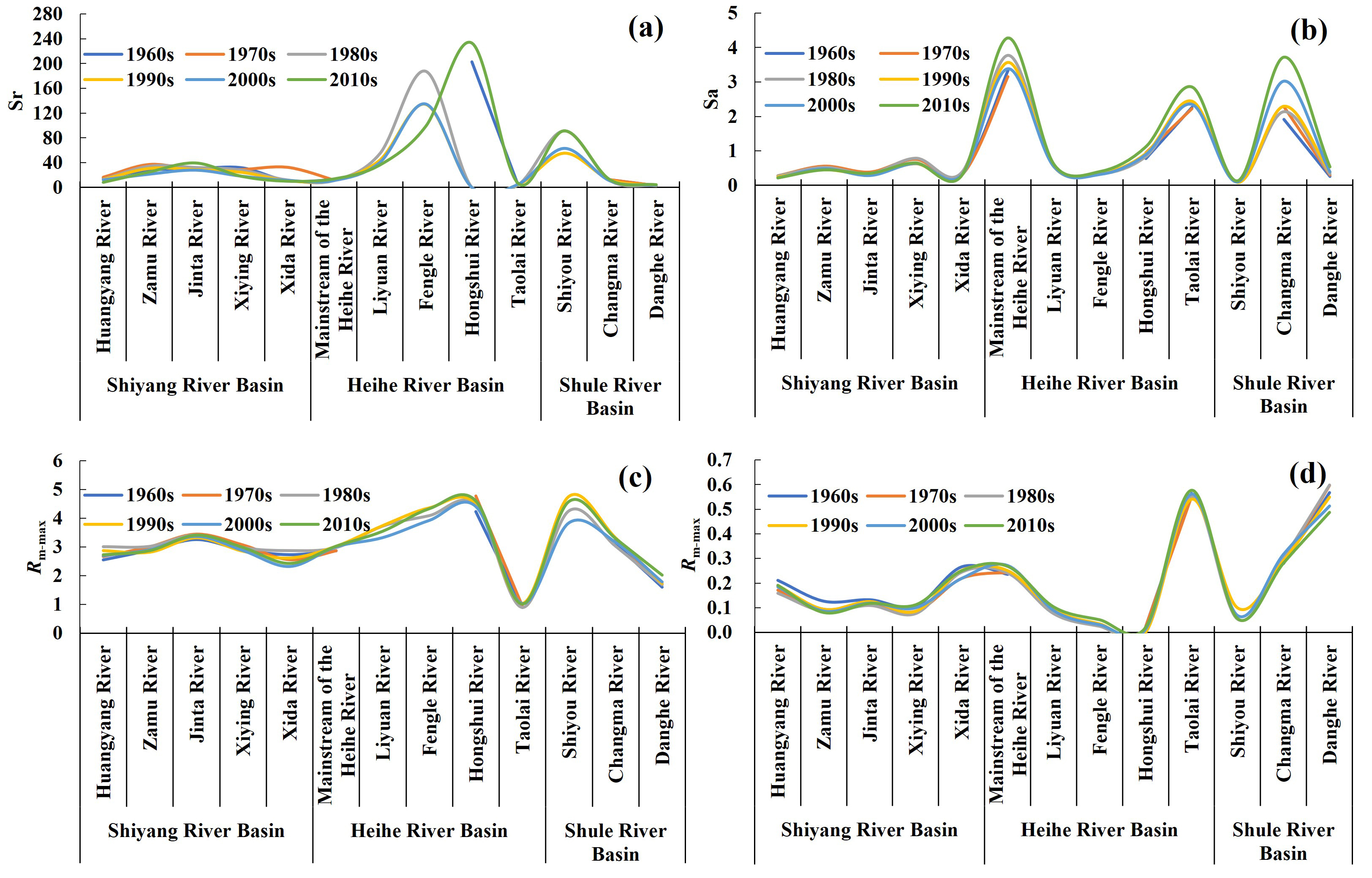 研究發(fā)現(xiàn):1、討賴河及其以西河流(除石油河外)出山徑流年內分配不均勻性呈上升趨勢,相反,以東河流呈下降趨勢,但Cv和Cr值仍然很高(圖1);2、石羊河流域年內徑流集中期在年際分布上具有相對離散的特征,1965-2018年期間,石羊河流域徑流年內集中期極差值均在40°以上,且黃羊河集中期極差值達到93°,即集中期出現(xiàn)時間相差三個月左右。黑河流域集中期極差值均小于45°,則相對集中,梨園河、豐樂河、洪水河的徑流年內集中度均大于0.6。疏勒河流域的集中度與集中期具有明顯差異,石油河集中期主要分布在160°~200°(約6月末至8月初),集中度分布在0.6~0.9;昌馬河集中期主要分布在180°~200°(7月初至8月初),集中度分布在0.4~0.7;黨河集中期主要分布在130°~200°(5月末至8月初),集中度分布在0.1~0.4。在2000年后,三個流域的集中期均有所后移(圖2)??傮w上相對變化幅度由大到小為:洪水河>豐樂河>石油河>梨園河>金塔河>雜木河>西營河>西大河>黃羊河>黑河干流>昌馬河>討賴河>黨河(圖3);3、梨園河及以東河流年內徑流分配曲線的峰度系數(shù)均小于零,相對于正態(tài)分布來說,峰面更加平緩,年內極端徑流出現(xiàn)的概率更?。灰晕鳎ǔh河外)峰度系數(shù)均大于零,相對于正態(tài)分布來說,峰面更加陡峭,徑流更加集中,年內極端徑流出現(xiàn)的概率更高(圖4)。相關研究結果對河西走廊水資源的規(guī)劃和管理具有實際意義,并為預測區(qū)域水資源未來變化提供了科學參考。