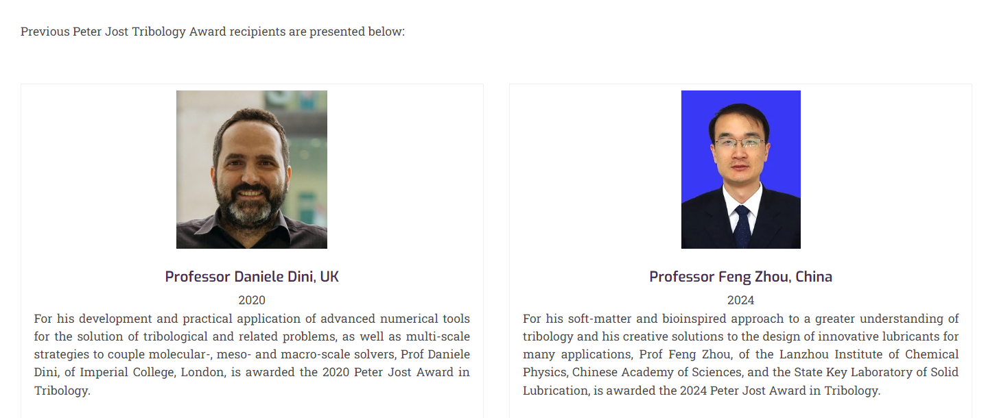 ????Peter Jost Tribology Award是由國際摩擦學(xué)理事會2020年設(shè)立的一個重要獎項(xiàng),旨在表彰世界摩擦學(xué)領(lǐng)域做出杰出貢獻(xiàn)的科學(xué)家和工程師,特別是在提高摩擦學(xué)理論理解、開發(fā)新型潤滑材料、改進(jìn)材料摩擦和磨損性能等方面有著突出貢獻(xiàn)的人士,取得的成果不僅具有重要的學(xué)術(shù)價值,還應(yīng)該對工業(yè)和實(shí)際應(yīng)用產(chǎn)生深遠(yuǎn)影響。