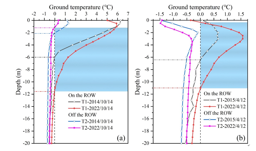 研究表明,管周多年凍土迅速退化,距離管道一線2米處的年最大融化深度以每年0.68 m的速度下降,至2022年融化深度已達到11.4m,融區(qū)水平方向約51m。管道一線、二線周圍的融區(qū)在不斷擴張并呈現(xiàn)逐漸貫通的趨勢。凍土融化引起的管道下沉和地表差異性融沉導(dǎo)致了熱融洼地和積水、冰椎的規(guī)律性分布。
