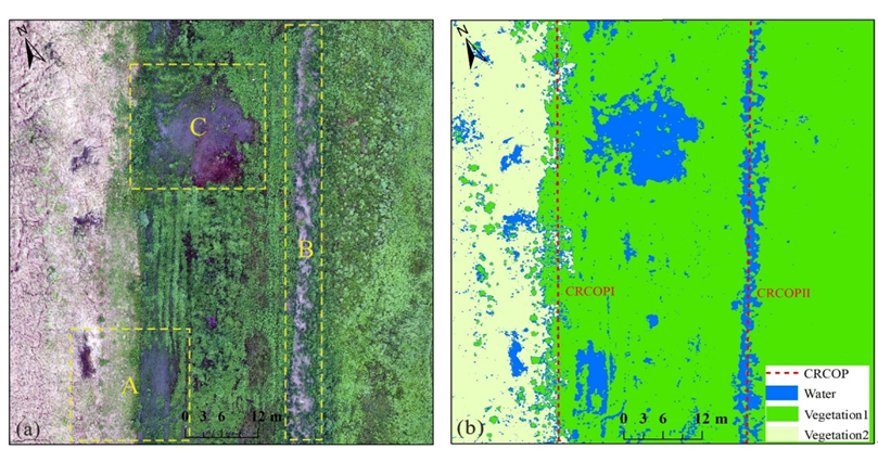 圖3 管道沿線積水分布?。╝)無人機正射影像?。╞)影像監(jiān)督分類結(jié)果