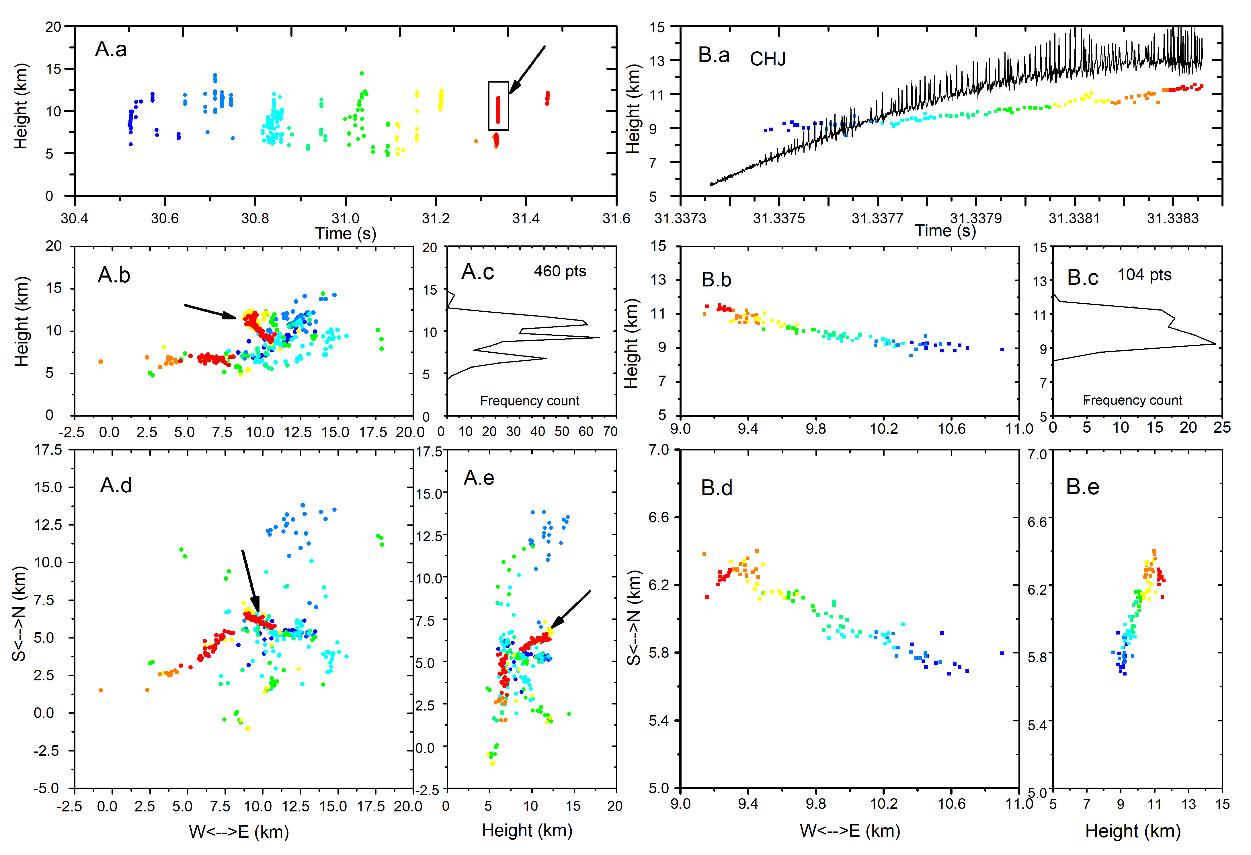 圖 1. 云閃(A)及其規(guī)則脈沖爆發(fā)序列?。≧PBs,B) 的三維觀測?。╝) 高度-時間關(guān)系圖,以及在CHJ站測量的LF/VLF電場,該站作為坐標(biāo)原點;(b) 東-西方向的垂直投影;(c) 輻射源數(shù)量及高度統(tǒng)計(RPBs 在 1 毫秒內(nèi)產(chǎn)生104脈沖);(d ,e) 平面圖和輻射源的南-北方向垂直投影(圖A出自 Fan 等 ,2018)。
