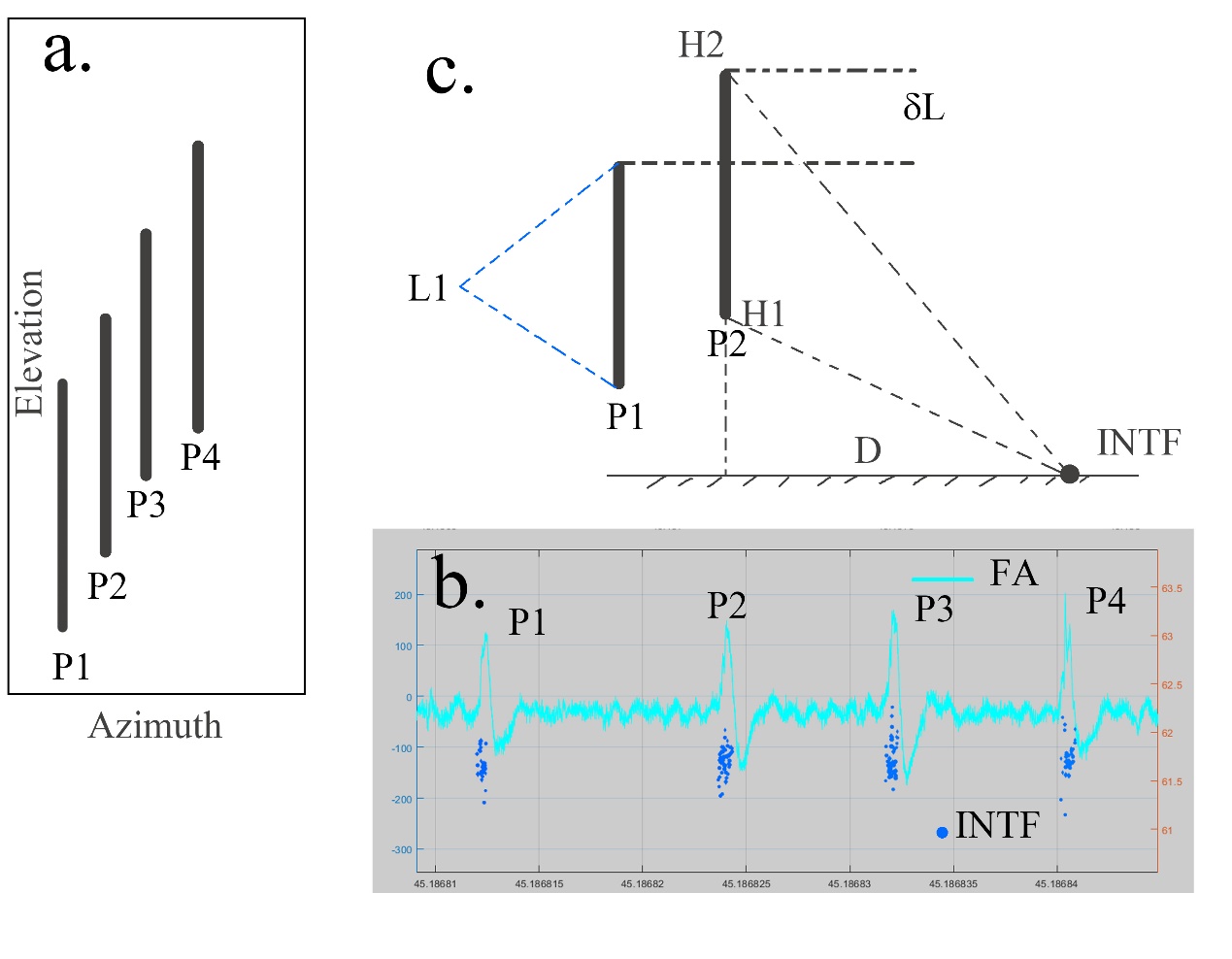 圖2. VHF干涉儀(Fan et al.,2023a;2023b)對規(guī)則脈沖爆發(fā)序列中連續(xù)脈沖的二維觀測結(jié)果,顯示這些脈沖比正常的直竄先導(dǎo)速度更快,并且從一個脈沖到另一個脈沖之間重疊較強(qiáng)?。╝)。從平面距離 D = 5.8 公里和干涉儀仰角的差異(例如,60.5° 和 60°),可以得出脈沖的 VHF輻射源的垂直范圍約為 205 米 (c)。這一現(xiàn)象發(fā)生在約 2 微秒的時間間隔內(nèi),對應(yīng)的速度約為 108 米/秒。脈沖代表的擊穿速度遠(yuǎn)高于已知的閃電先導(dǎo)通道發(fā)展速度。