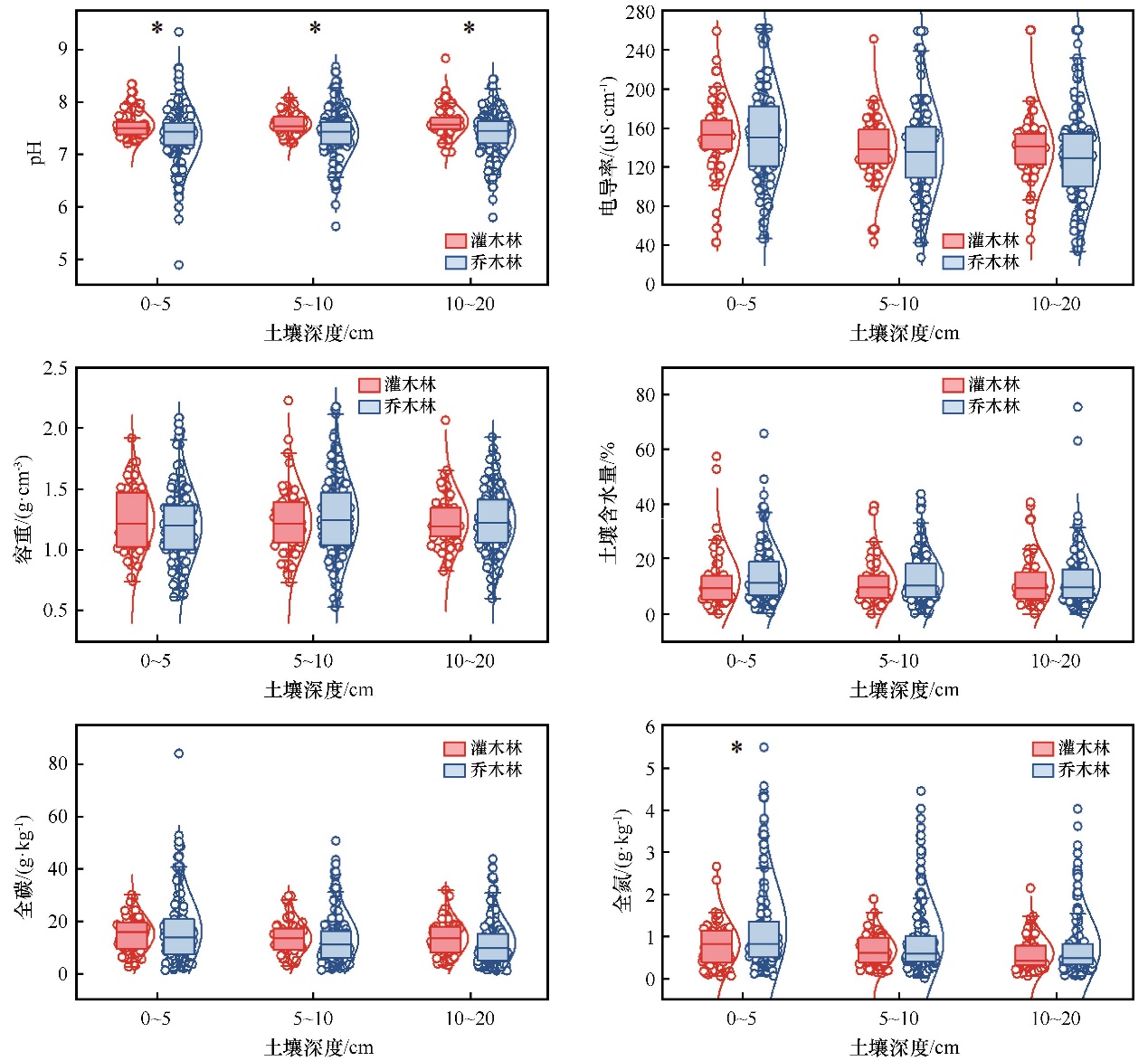 研究結(jié)果表明,農(nóng)牧交錯(cuò)帶人工林土壤整體呈弱堿性,電導(dǎo)率153.55±3.02 μS·cm-1、土壤容重0.53~2.28 g·cm-3、土壤含水量12.54%±0.62%,土壤全碳和全氮含量分別為13.74±0.61 g·kg-1和0.88±0.05 g·kg-1。農(nóng)牧交錯(cuò)帶人工林土壤自西向東酸性增強(qiáng)、容重下降、含水量增加、全碳含量下降、全氮含量增加。在氣候梯度上,人工林土壤pH值、電導(dǎo)率、容重與降水量顯著負(fù)相關(guān),而土壤含水量、全碳和全氮含量與年降水量顯著正相關(guān);人工林土壤全碳和全氮含量與年均氣溫和干燥度指數(shù)均顯著負(fù)相關(guān)。區(qū)域尺度上,喬木林土壤pH值顯著低于灌木林土壤,灌木林土壤全碳和全氮含量均高于喬木林(圖2)。