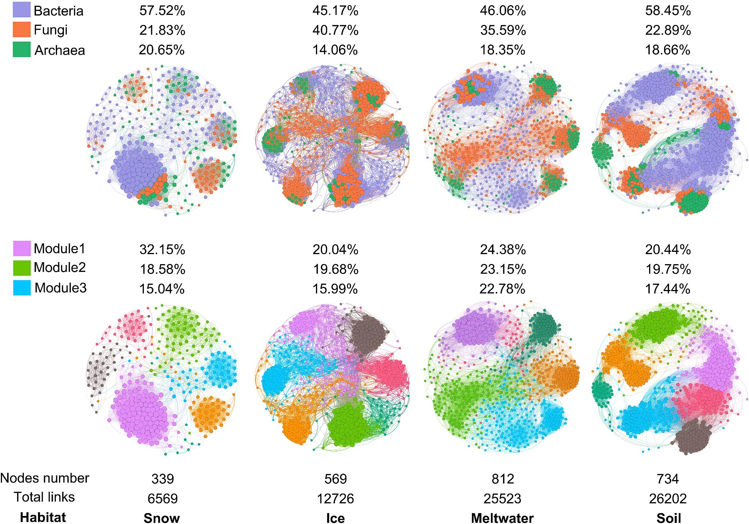 圖 1. 冰川四種生境中細(xì)菌、真菌和古菌群落的跨營(yíng)養(yǎng)級(jí)網(wǎng)絡(luò)關(guān)系
