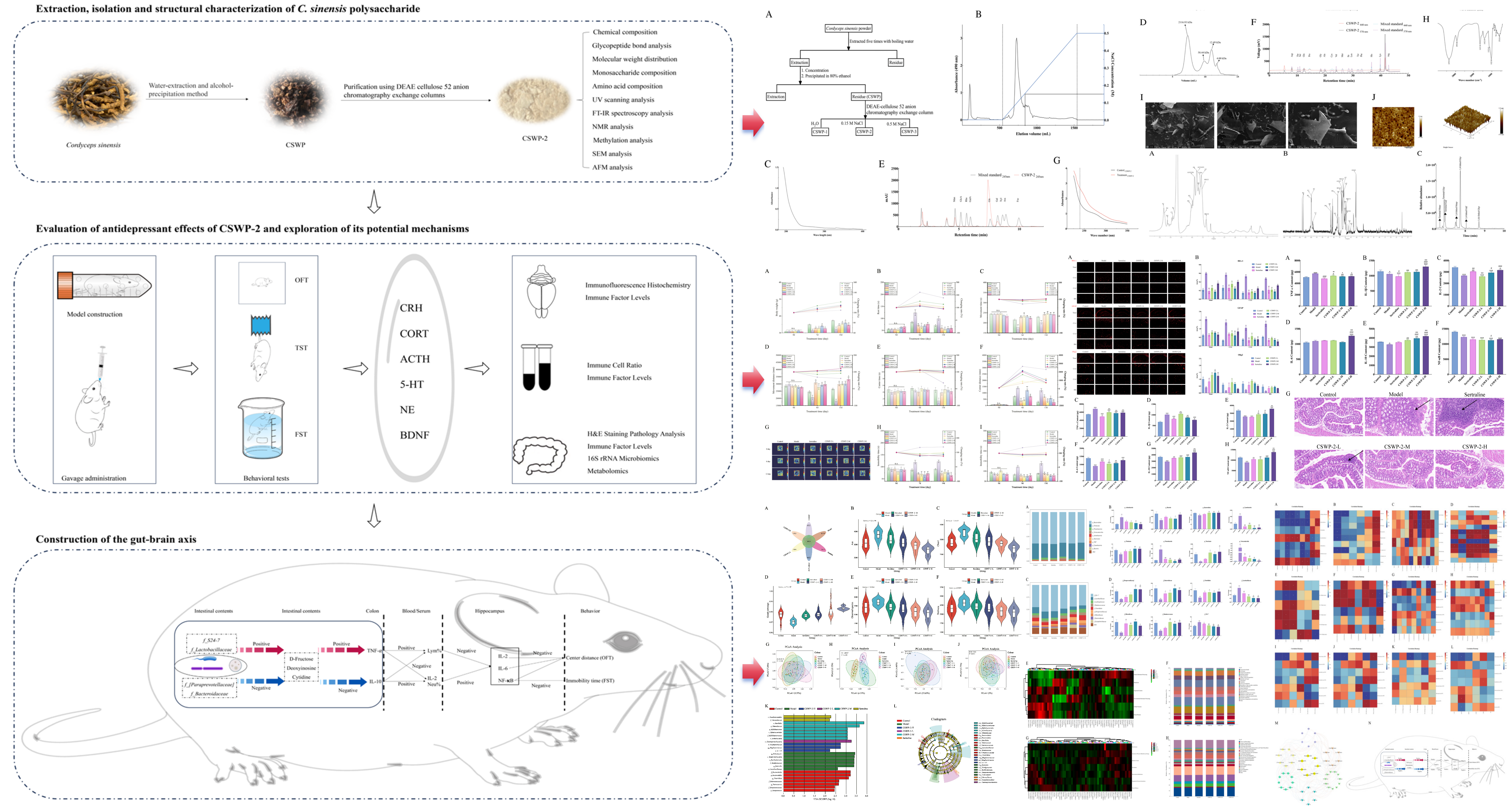 中國科學院西北高原生物研究所高原藏藥資源質控與藥理毒理評價研究團隊采用水提醇沉法結合離子交換柱層析,從冬蟲夏草中得到一種CSWP-2多糖組分,隨后對其進行組成、結構和抗抑郁作用研究。結構研究結果表明,CSWP-2主要是由1,4-linked ??-D-Glcp、1,4,6-linked ??-D-Glcp、??-1,6-Galf和??-1,6-Manp等糖基連接組成??挂钟糇饔醚芯拷Y果表明,CSWP-2通過調整微生物群(f_S24-7,f_Lactobacillaceae,f_[Paraprevotellaceae]和 f_Bacteroidaceae)影響ABC轉運體信號通路,導致代謝物(D-fructose,deoxyinosine和cytidine)水平變化,從而調節(jié)機體的免疫水平,最終改善小鼠的抑郁樣行為。該研究為冬蟲夏草及其多糖成分在免疫調節(jié)及抗抑郁藥品研發(fā)中提供科學依據(jù)。