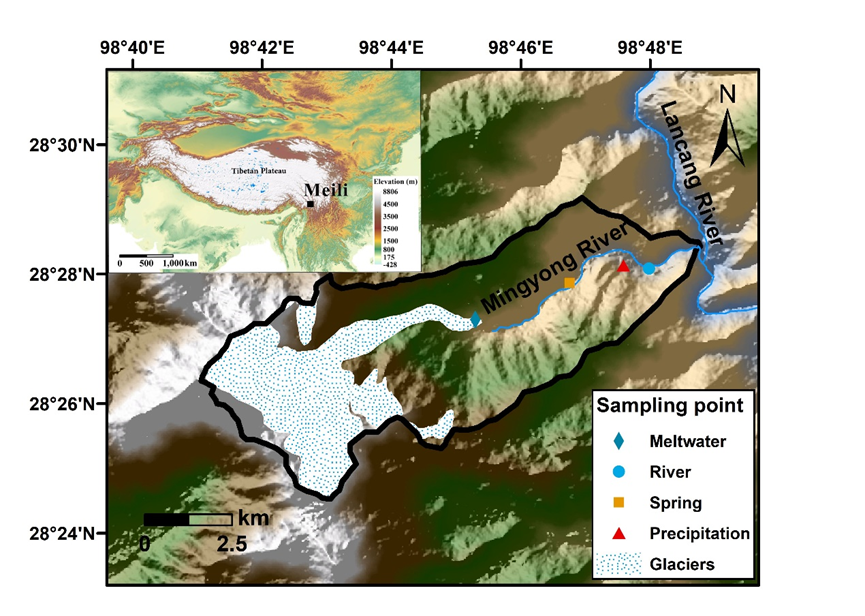 中國(guó)科學(xué)院西北生態(tài)環(huán)境資源研究院冰凍圈科學(xué)與凍土工程重點(diǎn)實(shí)驗(yàn)室科研團(tuán)隊(duì),聯(lián)合中國(guó)科學(xué)院地質(zhì)與地球物理研究所、浙江師范大學(xué)、云南大學(xué)等多家單位,依托云南麗江玉龍雪山冰凍圈與可持續(xù)發(fā)展國(guó)家野外科學(xué)觀測(cè)研究站“一站四區(qū)”觀測(cè)網(wǎng),在梅里雪山明永河流域開(kāi)展了為期一年的日尺度觀測(cè),剖析冰川徑流中總汞濃度的變化規(guī)律及控制因素,量化汞的輸入通量,并評(píng)估明永河流域以及整個(gè)青藏高原冰川徑流中總汞的輸出通量。