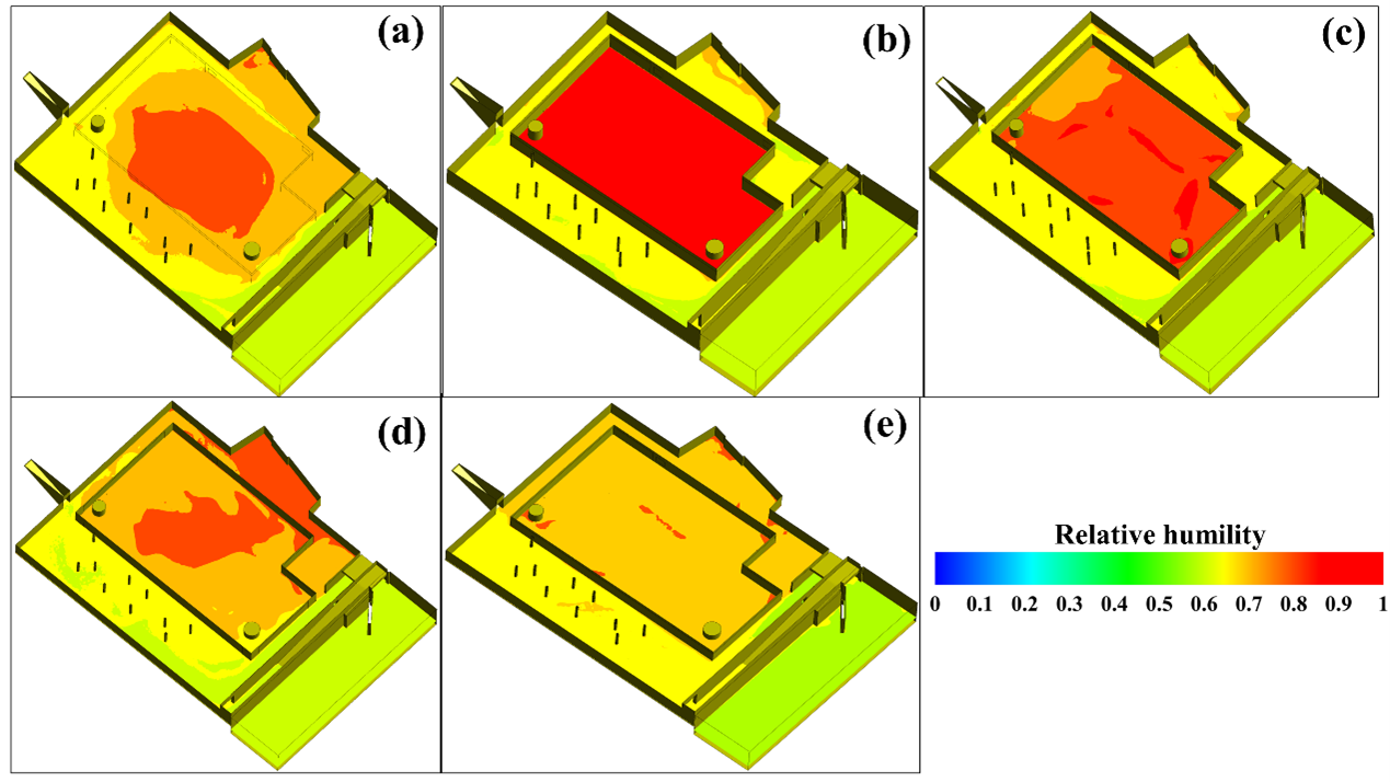 圖3? 5個(gè)不同改造階段遺址內(nèi)部的相對(duì)濕度分布:(a)I階段;(b)II階段;(c)III階段;(d)IV階段;(e)V階段。