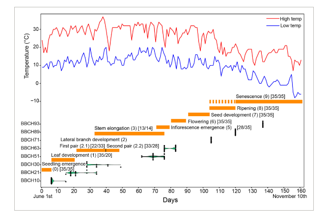 生長(zhǎng)發(fā)育階段及其標(biāo)志性發(fā)育事件的確認(rèn)是開(kāi)展遺傳學(xué)研究、建立表型變異和遺傳控制基因之間因果關(guān)系的重要前提條件?;趪?guó)際BBCH編碼系統(tǒng),課題組定義了9個(gè)沙蓬生長(zhǎng)發(fā)育階段,涵蓋了整個(gè)生活史,明確了標(biāo)志性發(fā)育事件,建立了沙蓬BBCH編碼系統(tǒng)。通過(guò)大田實(shí)驗(yàn),驗(yàn)證了該編碼系統(tǒng)的可行性,量化了各個(gè)主要階段及其次級(jí)細(xì)分階段的時(shí)間持續(xù)范圍,為開(kāi)展沙蓬種質(zhì)資源評(píng)價(jià)、分子遺傳學(xué)研究和遺傳馴化建立了生長(zhǎng)發(fā)育時(shí)期轉(zhuǎn)換的表型參考標(biāo)準(zhǔn)。