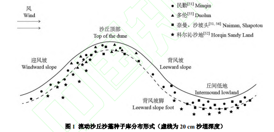 圖5??流動(dòng)沙丘沙蓬種子庫(kù)分布形式(虛線為 20 cm 沙埋深度)?
