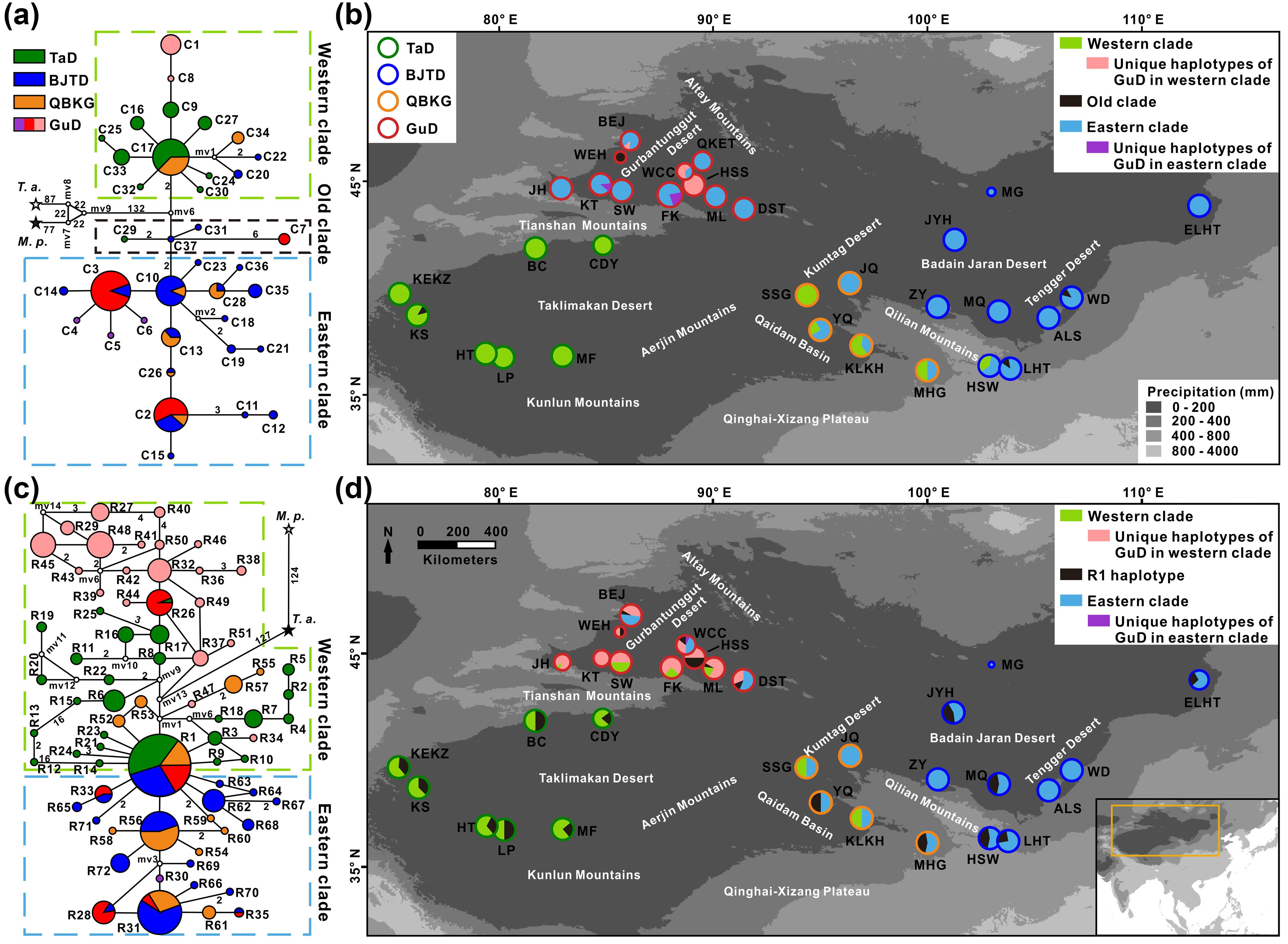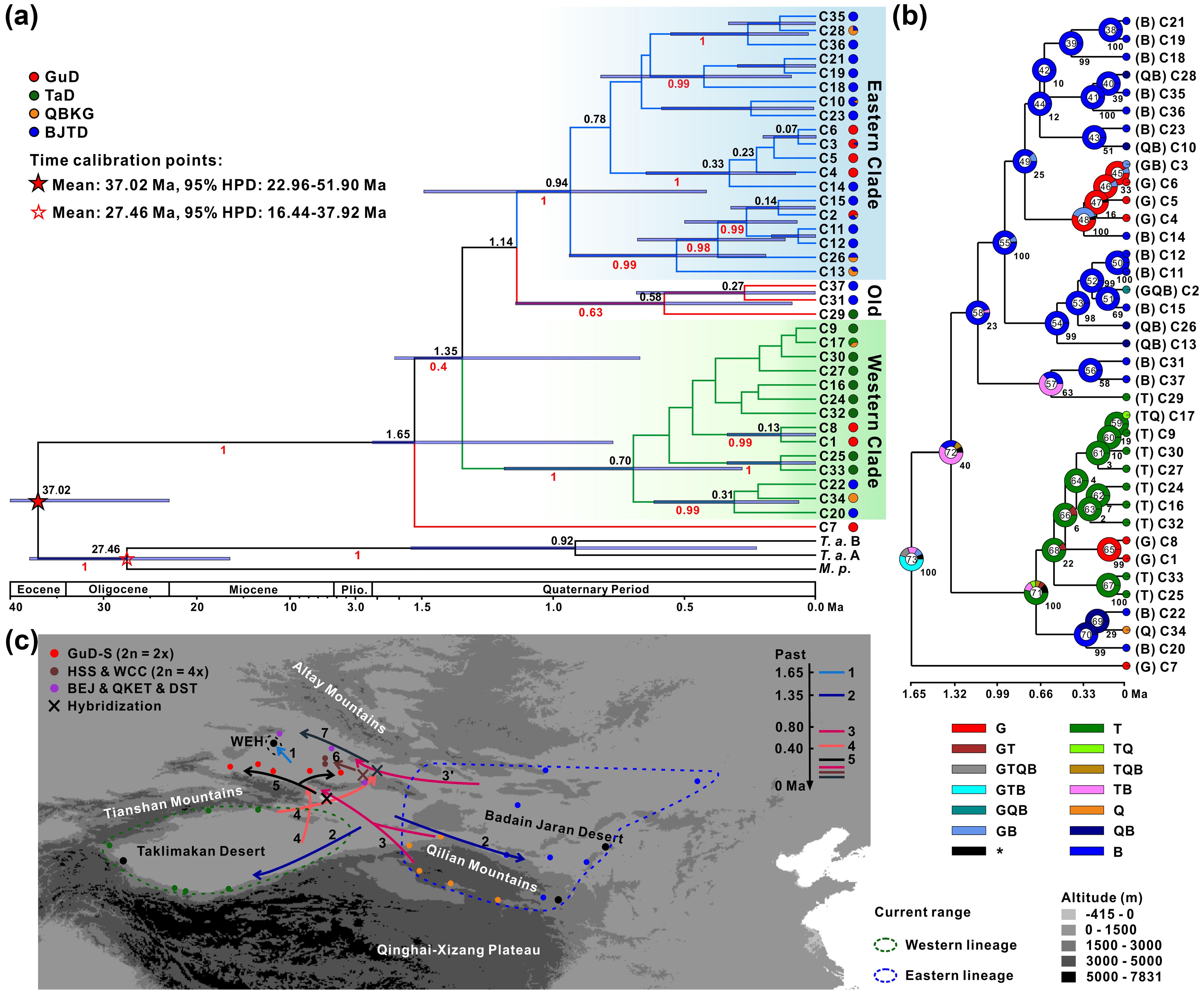 為了進(jìn)一步闡明紅砂不同支系的形成歷史,厘清雜交物種形成在北疆紅砂生物多樣性形成中的作用,中國科學(xué)院西北生態(tài)環(huán)境資源研究院馬小飛課題組采集了紅砂物種范圍的32個(gè)群體,通過分析并比對母系遺傳的cpDNA序列和雙親遺傳的nrITS序列在群體間的遺傳變異模式,重新深入解析了紅砂的譜系地理結(jié)構(gòu)及其時(shí)空演化歷史。