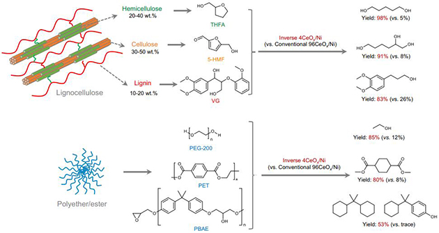 圖1. CeOx/Ni反相催化劑實現(xiàn)多種生物基化合物及廢棄塑料的高值化利用