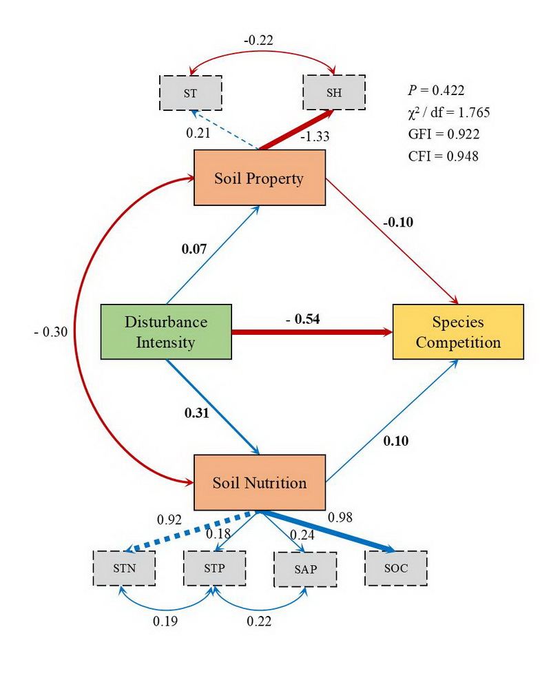 中國科學院西北高原生物研究所動物生態(tài)與資源保護研究團隊在青海海北高寒草地生態(tài)系統(tǒng)國家野外科學觀測研究站開展夏季植被、土壤和高原鼠兔密度調查,構建維管植物系統(tǒng)發(fā)育樹,分析系統(tǒng)發(fā)育結構類型,并采用廣義可加模型和結構方程模型,解析高原鼠兔干擾強度和土壤環(huán)境因子對植物群落系統(tǒng)發(fā)育結構和物種競爭強度的作用格局。結果表明,高原鼠兔干擾改變了植物群落的優(yōu)勢度排序,增加了物種周轉率,降低了種間競爭強度,促進系統(tǒng)發(fā)育結構的分散,促進了不同物種的共存。以上研究結果表明,高原鼠兔作為青藏高原高寒草甸的“異源工程師”,并沒有表現(xiàn)出強烈的“生境過濾器”作用,而在多物種共存的植物群落穩(wěn)態(tài)中起到重要作用。本研究為探討小型食草動物干擾對草地植物群落系統(tǒng)結構發(fā)育的影響提供了新的證據(jù)。