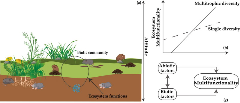 概念框架:(a) 生物群落由三個(gè)營養(yǎng)級組成—植物、嚙齒動物和微生物;(b) 多營養(yǎng)級多樣性能夠增強(qiáng)生態(tài)系統(tǒng)多功能性;(c) 生物因子和非生物因子對生態(tài)系統(tǒng)多功能性具有直接和間接影響