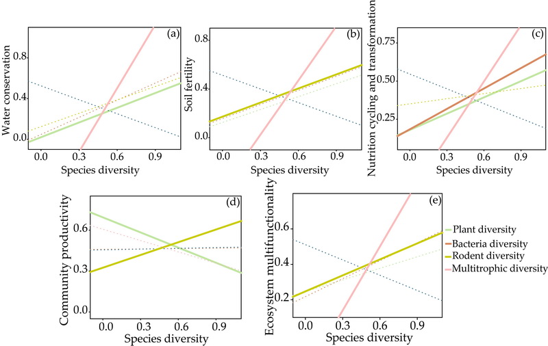 不同營養(yǎng)級物種多樣性對生態(tài)系統(tǒng)功能的影響:(a) 水分保持;(b) 土壤肥力;(c) 養(yǎng)分循環(huán)與轉(zhuǎn)化;(d) 群落生產(chǎn)力;(e) 生態(tài)系統(tǒng)多功能性。實(shí)線表示顯著關(guān)系,虛線表示無顯著關(guān)系