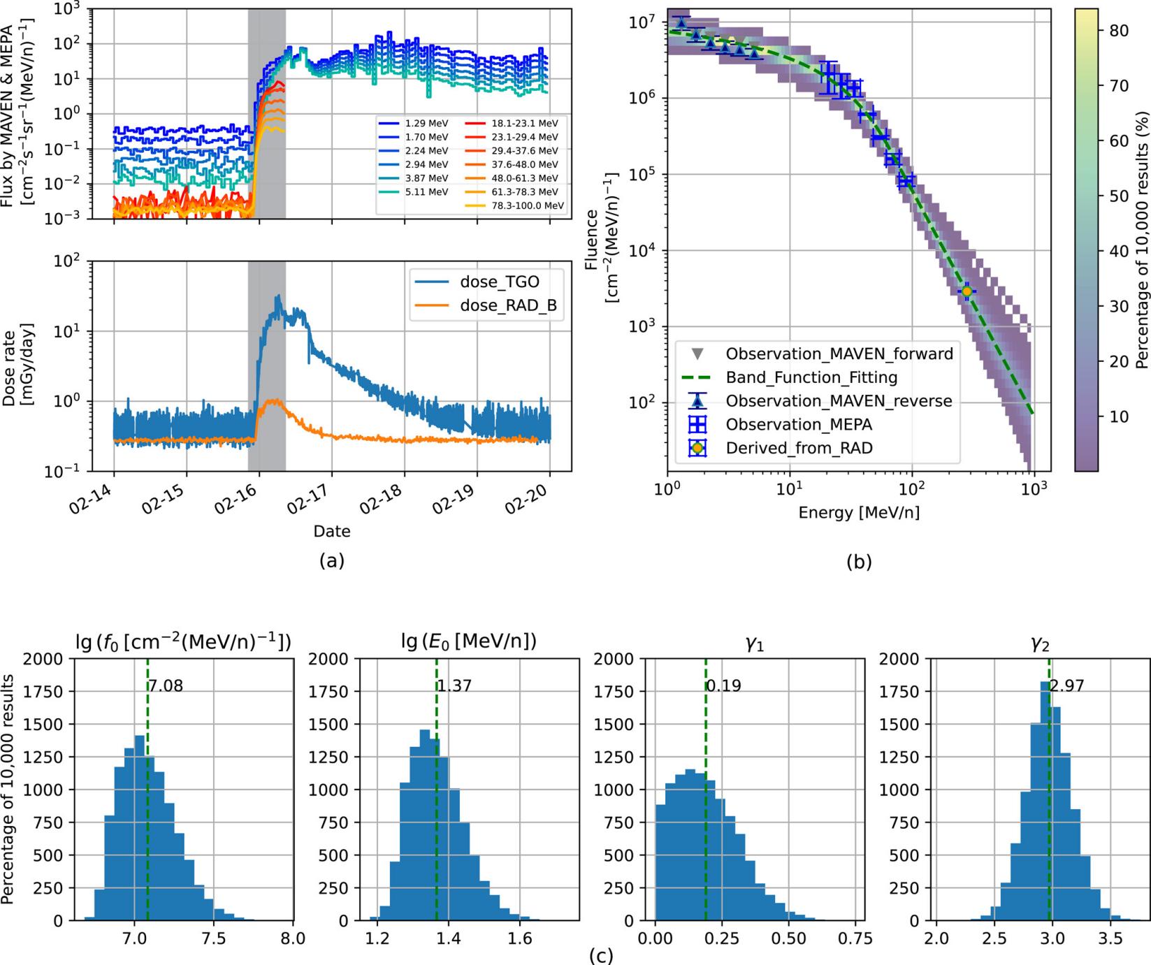 本研究使用了多個(gè)探測器數(shù)據(jù)來構(gòu)建相關(guān)質(zhì)子能譜。中低能段的質(zhì)子能譜由能量粒子分析儀和美國高能粒子儀提供。更高能段的質(zhì)子通量是團(tuán)隊(duì)結(jié)合火星表面的輻射評(píng)估探測器和火星粒子傳輸模型模擬反演得到。研究團(tuán)隊(duì)通過對上述觀測和反演的能譜進(jìn)行擬合,得到了此次太陽高能粒子事件在火星空間1~1000MeV能量范圍內(nèi)的完整質(zhì)子能譜。