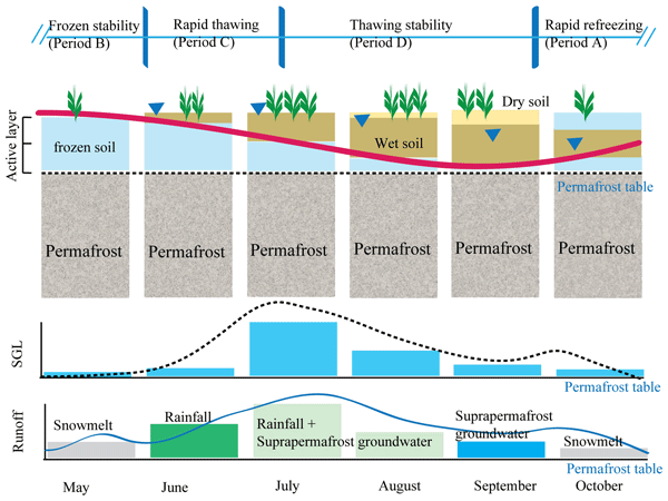 圖1. 多年凍土活動層凍融過程“土壤水-凍土層上水-地表徑流”動態(tài)的響應理論框架