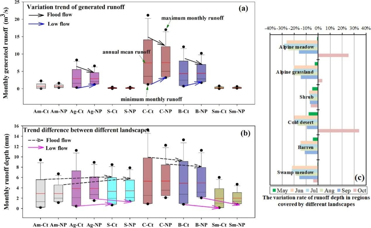圖2.凍土退化對典型流域不同下墊面的徑流過程及水源涵養(yǎng)能力影響。橫坐標Am,Ag,S,B,C,和?Sm 分別表示高寒草甸、高寒草原、灌叢、裸地、寒漠和沼澤草甸.?Ct?和?NP?分別表示現狀和凍土退化情景