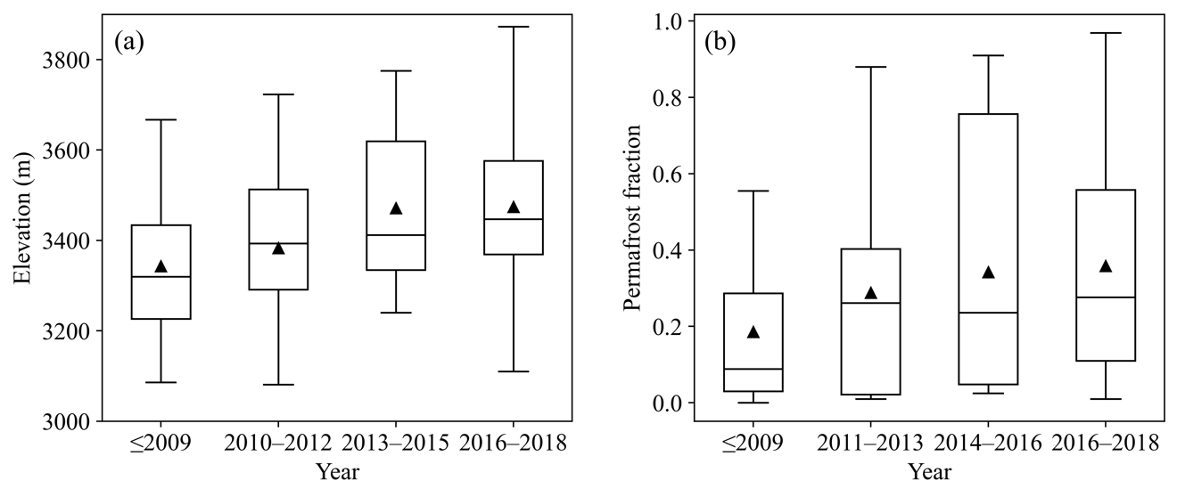 圖2:(a) 不同時(shí)期滑坡事件的海拔變化;(b) 滑坡事件對應(yīng)的多年凍土變化趨勢