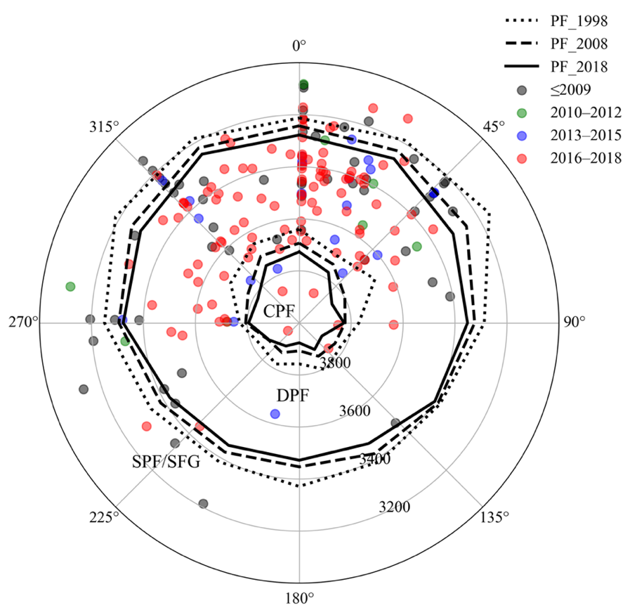 圖3:多年凍土邊界與滑坡的海拔、坡向和分布關(guān)系。三種不同線型分別代表1998年、2008年和2018年間稀疏多年凍土(SPF)、不連續(xù)多年凍土(DPF)和連續(xù)多年凍土(CPF)邊界的平均海拔。內(nèi)圈的三條線為SPF到DPF的過渡區(qū),外圈的三條線為DPF到CPF的過渡區(qū)。不同顏色的小圓點(diǎn)表示滑坡在各時(shí)間段的海拔、坡向和數(shù)量分布特征