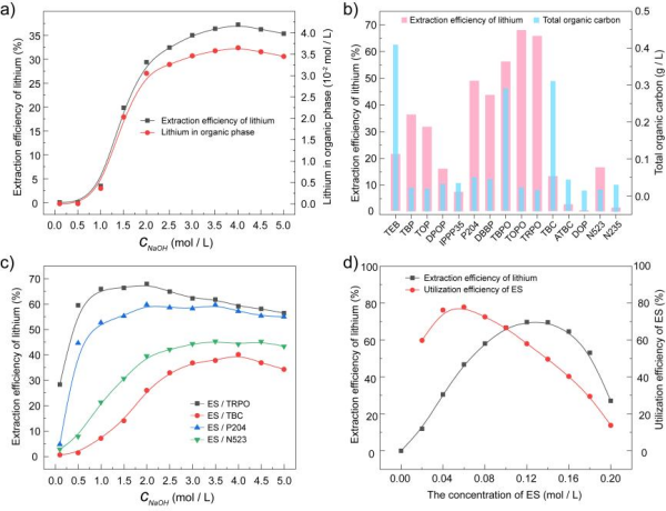 該研究為從堿性溶液中分離鋰提供了一種有效的方法,通過對ES和TRPO萃取體系的研究,不僅實現了高Na/Li比例溶液中鋰的高效回收,而且在理論上闡明了萃取過程的分子機制,為后續(xù)萃取劑構效關系和萃取劑的設計研究提供了理論基礎。