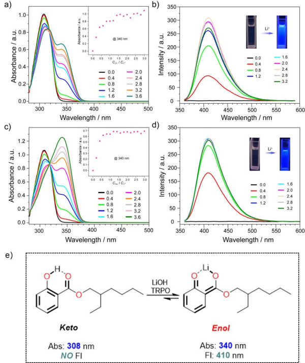 中國科學院青海鹽湖研究所研究團隊對2-乙基己基水楊酸(ES)和三烷基磷酸氧化物(TRPO)混合萃取體系進行了平衡、過程和機理研究。系統(tǒng)研究了影響鋰萃取的因素,如有機相組成、水相條件、萃取時間和ES萃取系統(tǒng)的酸堿耐受性。通過平衡研究,設計了從碳酸鋰母液中回收鋰的整個過程,包括萃取、洗滌、剝離和再生,并成功回收了99%的鋰,得到了含25.85 g/L鋰和0.08 g/L鈉的鋰富集溶液。研究表明,萃取過程是熱力學自發(fā)的熵增過程,在分子水平上,通過紫外-可見光譜(UV–Vis)、熒光光譜(Fl)、核磁共振(1H NMR)和傅里葉變換紅外光譜(FT-IR)闡明了配位機制。