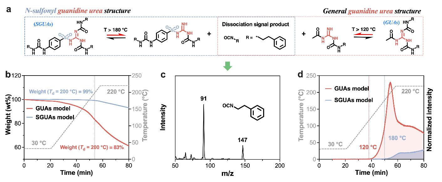 由于胍胺脲鍵具有高度的解離性,聚胍脲材料的熱穩(wěn)定性和尺寸穩(wěn)定性表現(xiàn)較差。針對這一問題,近期報道了一種N-磺?;译褰Y(jié)構(gòu)(SGUA)。相比于GUA結(jié)構(gòu),SGUA結(jié)構(gòu)在保持動態(tài)特性的同時,其解離溫度得到了很大提升,從120 °C提升至180 °C(圖2)。相應(yīng)聚合物材料的熱穩(wěn)定性和尺寸穩(wěn)定性也得到了大幅提升。盡管SGUA結(jié)構(gòu)的解離溫度超過了180 °C,但這種材料在160 °C,20 MPa條件下仍能夠進行熱壓成型。網(wǎng)絡(luò)的流變行為表明,這種網(wǎng)絡(luò)不再遵循解離型交換反應(yīng)機制,而是符合結(jié)合型網(wǎng)絡(luò)交換的特點。相關(guān)成果以“N-Sulfonyl Guanidine Urea to Design Ultrastrong,Stable,and Recyclable Associative Dynamic Polyurea Networks”為題,發(fā)表在Macromolecules(2024,57,23,10938–10947)。