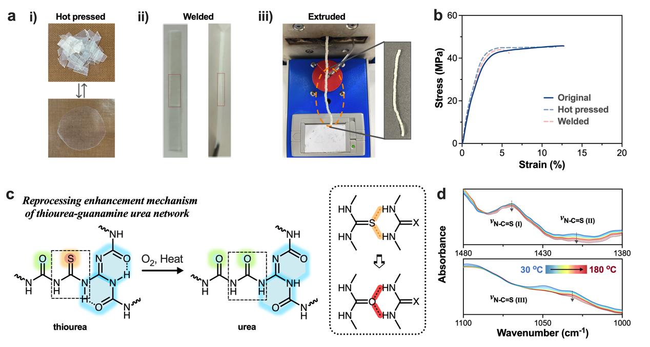 針對可逆交聯(lián)聚合物的連續(xù)再加工問題,研究人員提出了一種胍硫脲雙解離結(jié)構(gòu)的策略。通過胍胺脲鍵和硫脲鍵的雙解離結(jié)構(gòu),實現(xiàn)了材料的連續(xù)擠出加工。除此之外,胍硫脲網(wǎng)絡(luò)還能實現(xiàn)多種再加工方式,包括熱壓和焊接(圖3)。進一步通過與原料的解交聯(lián)和再交聯(lián)可實現(xiàn)網(wǎng)絡(luò)的閉環(huán)回收。相關(guān)成果以“Closed-Loop Recyclable and Extrusion Reprocessable Thermosets Enabled by Guanylthiourea Structure”為題,發(fā)表在Advanced Science(2024,11,2410773)。