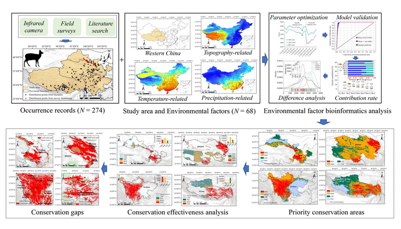 研究論文?Assessment approach for conservation effectiveness and gaps for endangered species based on habitat suitability: A case study of alpine musk deer in western China?近期發(fā)表于?Ecological Indicators(中國科學院2區(qū)TOP,IF = 7.00)。西北高原所特別研究助理江峰為第一作者,張同作研究員為通訊作者。該工作得到了青海省自然科學基金青年項目(2023-ZJ-952Q)和中國博士后科學基金特別資助項目(2024T170992)的資助。