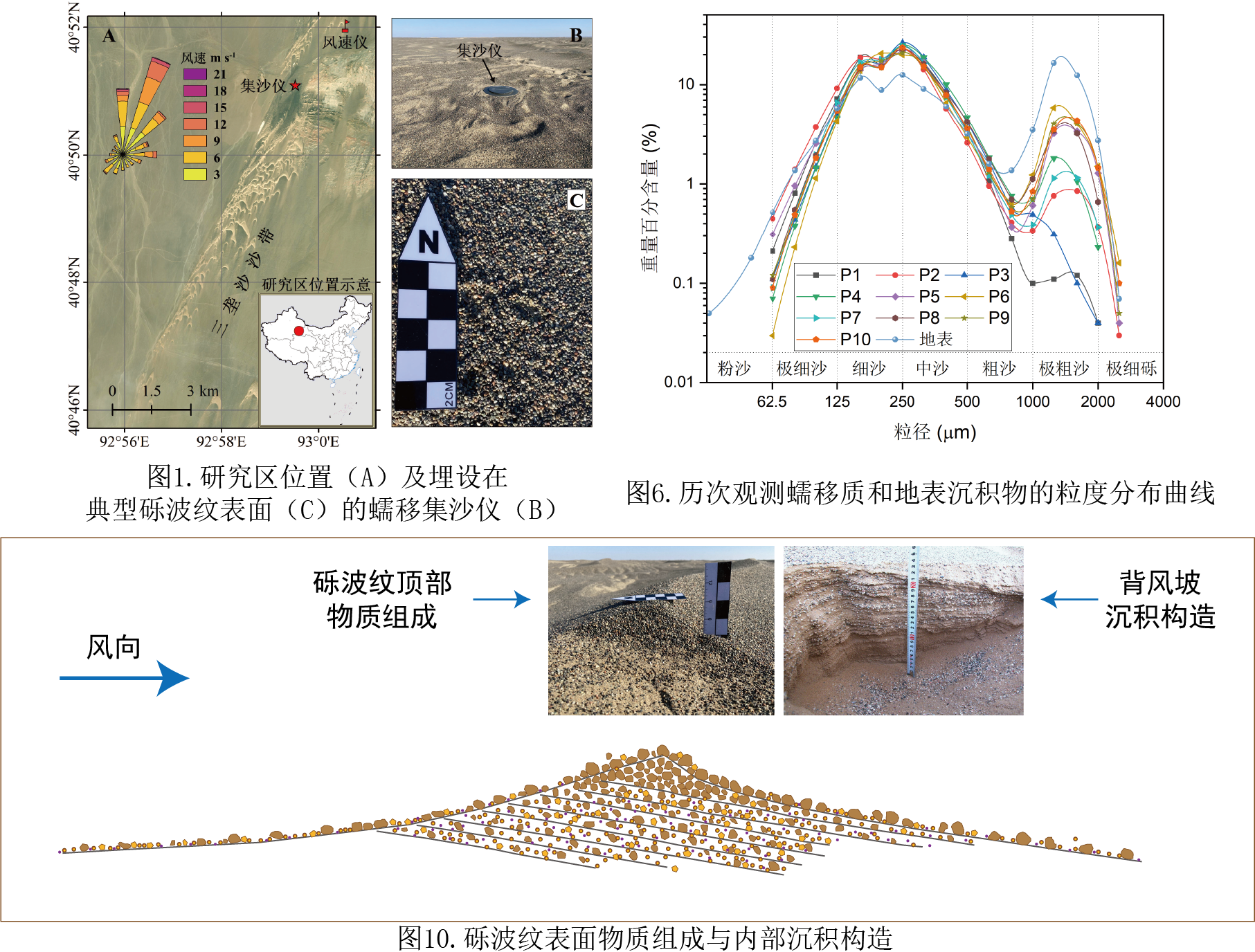 研究發(fā)現(xiàn),蠕移輸沙通量與起沙風(fēng)平均風(fēng)速之間存在相關(guān)性,最強(qiáng)的蠕移輸沙過程發(fā)生在夏季沙塵暴期間,而最弱的發(fā)生在冬季。除了風(fēng)況之外,沉積物粒度特征、不同方向的沙源供應(yīng)程度均影響蠕移輸沙通量和物質(zhì)組成。從沉積學(xué)上來看,礫波紋表面的蠕移運(yùn)動(dòng),對(duì)其內(nèi)部“滲入”結(jié)構(gòu)和粗細(xì)互層的前積紋層形成具有重要貢獻(xiàn)。