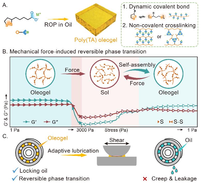 針對(duì)傳統(tǒng)潤滑油脂在新型高端裝備應(yīng)用中面臨爬移、泄漏、粘滯阻力高等難以應(yīng)對(duì)復(fù)雜多變工況的問題。近日,中國科學(xué)院蘭州化學(xué)物理研究所潤滑材料全國重點(diǎn)實(shí)驗(yàn)室材料表面與界面研究組通過構(gòu)筑具有機(jī)械力響應(yīng)特性的動(dòng)態(tài)共價(jià)網(wǎng)絡(luò),開發(fā)了一類具有力誘導(dǎo)可逆相轉(zhuǎn)變能力的自適應(yīng)油凝膠潤滑材料(PTA油凝膠)。PTA油凝膠可適應(yīng)設(shè)備啟停,在溶膠或凝膠狀態(tài)保持和迅速轉(zhuǎn)換,且具有出色的潤滑穩(wěn)定性、適應(yīng)不斷變化的運(yùn)動(dòng)工況。