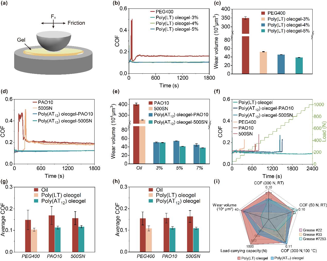 在極端和交變的摩擦條件下,PTA油凝膠表現(xiàn)出優(yōu)異的摩擦學(xué)性能和出色的潤滑穩(wěn)定性,進(jìn)一步證實(shí)其對(duì)于惡劣、可變工況的適應(yīng)性。通過與商用航空潤滑脂的系統(tǒng)對(duì)比,PTA油凝膠具有在多種測(cè)試條件下最為均衡的潤滑性能和最優(yōu)異的長期潤滑表現(xiàn)。