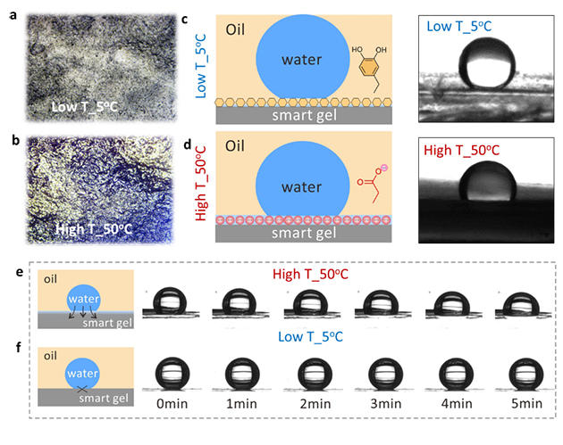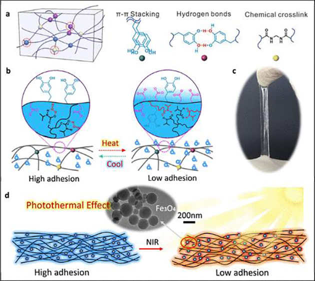 研究人員進一步揭示了其作用機制,通過近紅外光激發(fā)納米顆粒產(chǎn)生熱效應,誘導水凝膠發(fā)生溫度響應性相變,實現(xiàn)軟物質(zhì)表面水分子的滲出/吸收,改變其表面親水羧酸基團的分子構象,進而可逆地控制鄰苯二酚基團的屏蔽和暴露。這種基于界面分子構象變化調(diào)控的黏附機制具有無殘留、可重復使用的特點,為智能黏附材料的開發(fā)提供了新思路。