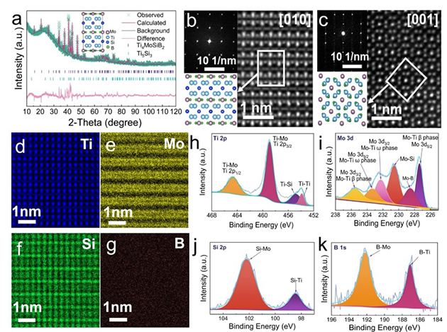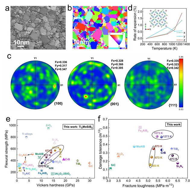 近日,中國(guó)科學(xué)院蘭州化學(xué)物理研究所蘭州潤(rùn)滑材料與技術(shù)創(chuàng)新中心基于T2相通過M位合金化構(gòu)筑策略成功合成了具有面外化學(xué)有序的四元層狀過渡金屬硼化物MAB相—Ti4MoSiB2陶瓷(圖1),并系統(tǒng)研究了其在寬溫域內(nèi)的力學(xué)性能和摩擦學(xué)行為,研究人員發(fā)現(xiàn)材料原子尺度上的層狀結(jié)構(gòu)在穿晶斷裂時(shí)有效引導(dǎo)裂紋偏轉(zhuǎn),改變裂紋擴(kuò)展路徑,提高低溫?cái)嗔秧g性;由于晶粒沿不同方向熱膨脹差異造成晶界的熱失配,進(jìn)而改變了斷裂模式,使材料在室溫至1000℃范圍內(nèi)表現(xiàn)出優(yōu)異的綜合力學(xué)性能,同時(shí)賦予了較傳統(tǒng)陶瓷優(yōu)異的損傷容限。與DD5高溫合金對(duì)摩時(shí)在全溫度范圍內(nèi)都具有良好的抗磨性能,尤其在高溫條件下摩擦化學(xué)反應(yīng)生成的具有氧空位TiO2,一定程度上實(shí)現(xiàn)減摩效果,并實(shí)現(xiàn)了“負(fù)磨損”現(xiàn)象。這些發(fā)現(xiàn)不僅豐富了MAB相材料的基礎(chǔ)理論,也為開發(fā)新型高溫結(jié)構(gòu)功能一體化材料提供了重要指導(dǎo)。