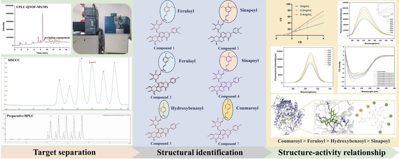 中國(guó)科學(xué)院西北高原生物研究所高原藏藥資源質(zhì)控與藥理毒理評(píng)價(jià)研究團(tuán)隊(duì)通過(guò)建立UPLC-QTOF-MS/MS結(jié)合高速逆流色譜和制備液相色譜的靶向分離技術(shù),成功從青稞苗中分離得到6個(gè)以大麥黃苷和皂草黃苷為母核的不同?;揎椀难苌?。通過(guò)多維度的分子相互作用研究發(fā)現(xiàn),大麥黃苷和皂草黃苷?;螅洇?葡萄糖苷酶抑制活性均明顯提高,表現(xiàn)為香豆?;?gt;阿魏?;?gt;對(duì)羥基苯甲?;?gt;芥子酰基。6個(gè)酰化黃酮與α-葡萄糖苷酶均具有較高的結(jié)合常數(shù),主要通過(guò)范德華力和氫鍵作用占據(jù)α-葡萄糖苷酶的活性位點(diǎn)并形成穩(wěn)定的復(fù)合物,并改變關(guān)鍵氨基酸殘基和二級(jí)結(jié)構(gòu),從而降低酶催化活性。該研究為復(fù)雜天然產(chǎn)物的靶向分離純化以及酰化黃酮與α-葡萄糖苷酶抑制活性之間的構(gòu)效關(guān)系的研究提供了新的思路。