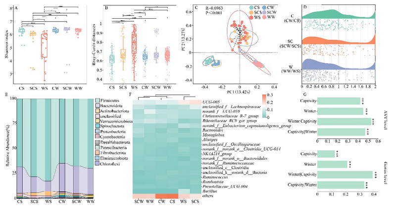 目前,腸道微生物群如何響應(yīng)極端環(huán)境變化的機(jī)制仍不明確。白唇鹿(Przewalskium albirostris)是青藏高原特有的國家一級重點保護(hù)動物,是研究動物微生物群對季節(jié)變化和人類干擾適應(yīng)機(jī)制的理想模型。中國科學(xué)院西北高原生物研究所動物生態(tài)與資源保護(hù)研究團(tuán)隊,通過整合 16S rRNA 測序、宏基因組學(xué)與非靶向代謝組學(xué)等多組學(xué)方法,系統(tǒng)解析了白唇鹿在冬季和圈養(yǎng)環(huán)境下的腸道微生物組成、功能潛力及代謝特征。該研究不僅為理解高原特有動物腸道微生態(tài)系統(tǒng)的動態(tài)變化與適應(yīng)策略提供了重要科學(xué)依據(jù),也從微生物學(xué)視角為瀕危物種的保護(hù)與管理提供了理論支持。