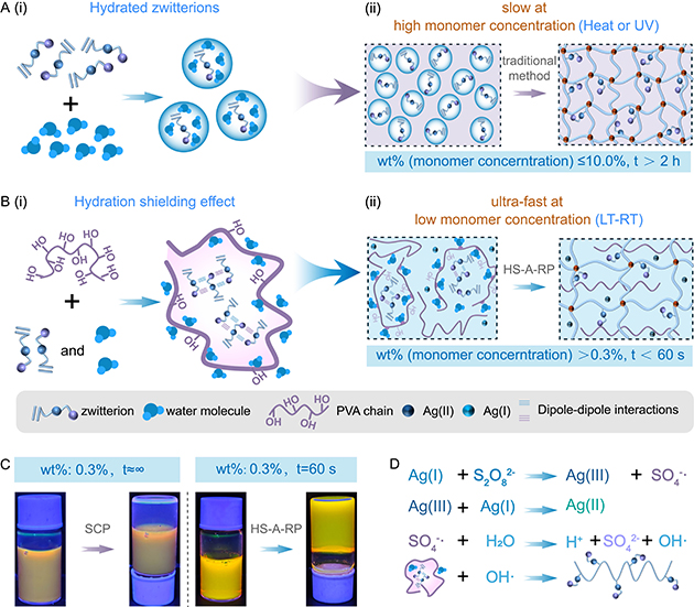 近日,中國科學院蘭州化學物理研究所潤滑材料全國重點實驗室材料表面與界面研究組周峰研究員團隊提出了基于一種基于“水合屏蔽”效應的聚兩性離子水凝膠制備新方法——HS-A-RP,創(chuàng)新地將PVA作為水合屏蔽劑引入Ag+-S2O82-氧化還原催化體系中,實現(xiàn)了通用性兩性離子單體在寬單體濃度范圍(質量分數(shù):0.3-50 wt%)、寬溫域(-5℃-37℃)內的超快速聚合(t<60 秒),且反應而無需外部能量(紫外光/熱)的輸入。