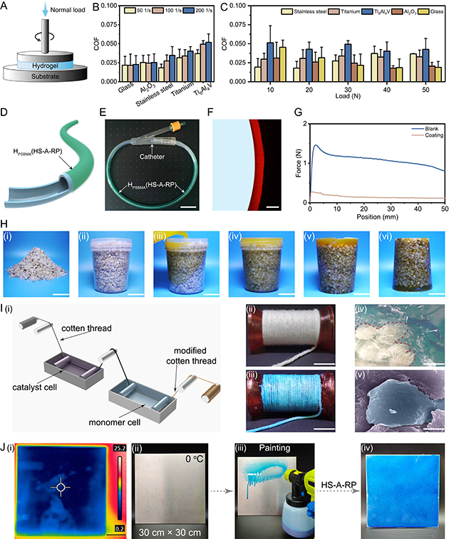 與傳統(tǒng)光/熱引發(fā)體系相比,HS-A-RP 制備的聚兩性離子水凝膠不僅具有更致密的網(wǎng)絡結構和更好的機械性能,還展現(xiàn)出了優(yōu)異的抗溶脹、潤滑、抗菌和防污性能。通過HS-A-RP方法制備的聚兩性離子水凝膠既能夠作為功能涂層有效改善生物醫(yī)用器械的表面潤滑性,又能實現(xiàn)對熱敏材料和砂礫的原位封裝。此外,快速凝膠化和寬溫域內可反應的特性使HS-A-RP能夠在不同基底表面和極端穩(wěn)定環(huán)境條件下規(guī)模化制備聚兩性離子水凝膠涂層。該方法不僅為聚兩性離子水凝膠的化學合成提供了新途徑,還極大地拓展了其在生物醫(yī)療、工程裝備等領域應用領域。