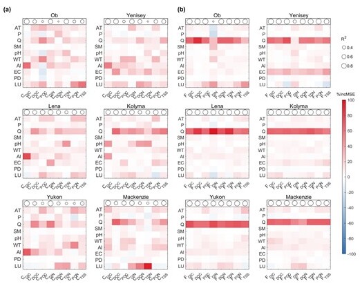 該研究利用隨機(jī)森林模型,集成了包括氣候、水文特征、河流化學(xué)性質(zhì)、土地覆蓋以及人口密度在內(nèi)的共30個(gè)潛在影響因子,通過置換重要性(%IncMSE)量化潛在影響因子的相對貢獻(xiàn),發(fā)現(xiàn)水文特征(%IncMSE:63.2 ± 15.4%)在驅(qū)動泛北極地區(qū)河流碳氮輸出中占主導(dǎo)地位。