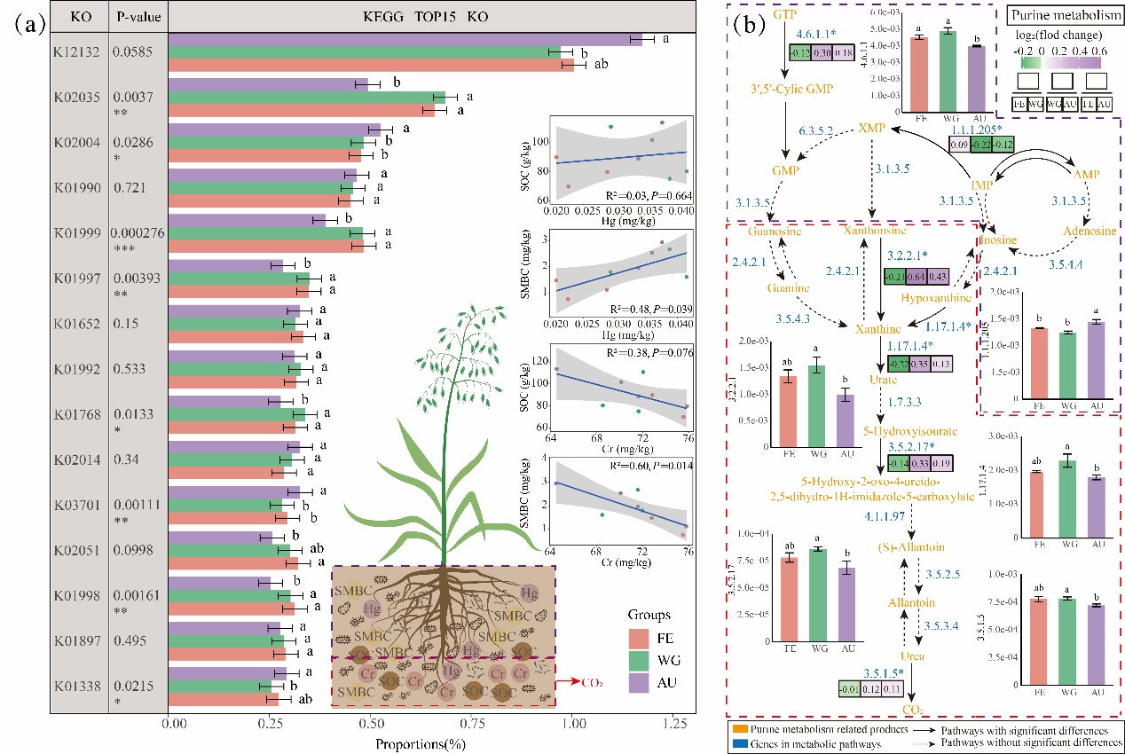針對這一問題,中國科學(xué)院西北高原生物研究所三江源草原生態(tài)系統(tǒng)國家觀測研究站團(tuán)隊在青藏高原祁連山南麓選擇了圍封(FE)、冬季放牧(WG)和開墾(AU)3種不同干擾的草地管理措施為研究對象,探明了微生物群落結(jié)構(gòu)和功能如何響應(yīng)因草地管理引起的植被群落和PTEs的變化,以及對它們的調(diào)控路徑。研究結(jié)果表明,草地管理措施改變了地上禾本科和豆科植被群落的結(jié)構(gòu)及地下生物量的分配,導(dǎo)致K的分布變化,進(jìn)而引起真菌群落結(jié)構(gòu)和氮代謝酶的顯著變化。Cr和Hg與微生物相互作用影響SOC和SMBC的代謝過程,可能對高寒草甸固碳具有一定積極作用,并且高寒草甸對PTEs具有良好的抗性。適度干擾的冬季放牧(WG)有利于維持高寒草地微生物群落結(jié)構(gòu)和功能的穩(wěn)定性。本研究為青藏高原祁連山高寒草甸的改善提供科學(xué)依據(jù)。