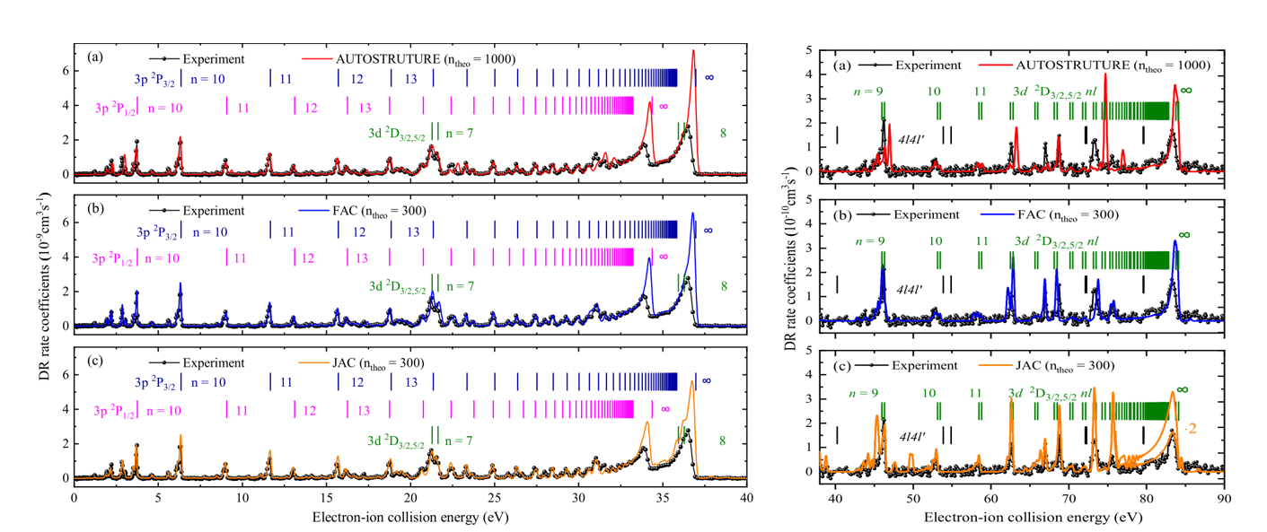 基于蘭州重離子加速器冷卻儲存環(huán)開展的高電荷態(tài)離子的雙電子復(fù)合精密譜學(xué)實(shí)驗(yàn)具有較高的能量分辨,且其電子-離子相對能量可大范圍精密調(diào)制,是目前唯一能夠精確測量低能碰撞復(fù)合截面關(guān)鍵數(shù)據(jù)的實(shí)驗(yàn)方法??蒲袌F(tuán)隊(duì)在對M殼層類鈉鐵離子 Fe15+的實(shí)驗(yàn)中,成功測量了 0-90 eV 能量范圍內(nèi)的復(fù)合速率系數(shù)。他們將實(shí)驗(yàn)結(jié)果與最新的理論Flexible Atomic Code (FAC) 、AUTOSTRUCTURE、Jena Atomic Calculator (JAC)計(jì)算的結(jié)果仔細(xì)對比,解析出每個(gè)共振結(jié)構(gòu)的來源。同時(shí),科研人員從雙電子復(fù)合速率系數(shù)得到了可用于等離子體建模的等離子體速率系數(shù),并與此前的理論數(shù)據(jù)作了對比研究。