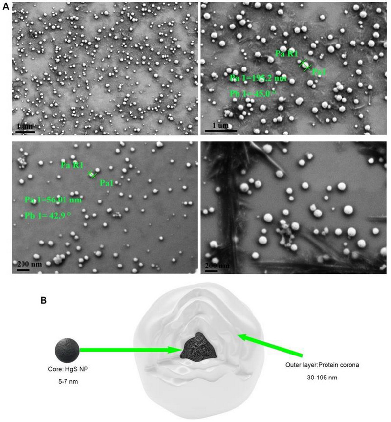 中國(guó)科學(xué)院西北高原生物研究所高原藥用資源生態(tài)保護(hù)與繁育研究團(tuán)隊(duì)通過建立創(chuàng)新性金屬制劑研究體系,首次在細(xì)胞、小鼠和人體血液中證實(shí)金屬制劑能夠被生物合成為粒徑均一的HgS 納米顆粒。更重要的是通過分離純化手段首次觀察到具有完整蛋白冠的金屬納米顆粒。相對(duì)純凈完整結(jié)構(gòu)的呈現(xiàn)不僅直觀證實(shí)了蛋白冠的存在,也為蛋白冠中蛋白質(zhì)的分析奠定了基礎(chǔ)。蛋白冠蛋白質(zhì)組成一直以來存在巨大分歧。本研究中通過分析HgS納米顆粒蛋白質(zhì)組成,證實(shí)金屬納米顆粒蛋白冠中蛋白質(zhì)類型多樣,初步排除了蛋白冠僅由血清白蛋白組成的相關(guān)報(bào)道。